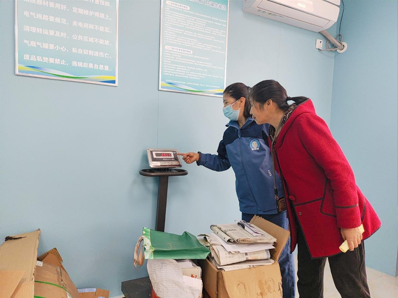 全新的再生资源回收中心吸引了当地居民前来参与,仅位于团风县罗家沟新村一号的再生资源回收中心,有12位居民从家中将分好类的可回收物,回收旧纸103公斤,塑料瓶45公斤,易拉罐4公斤,居民们获得现金收入296元,碳币293个。