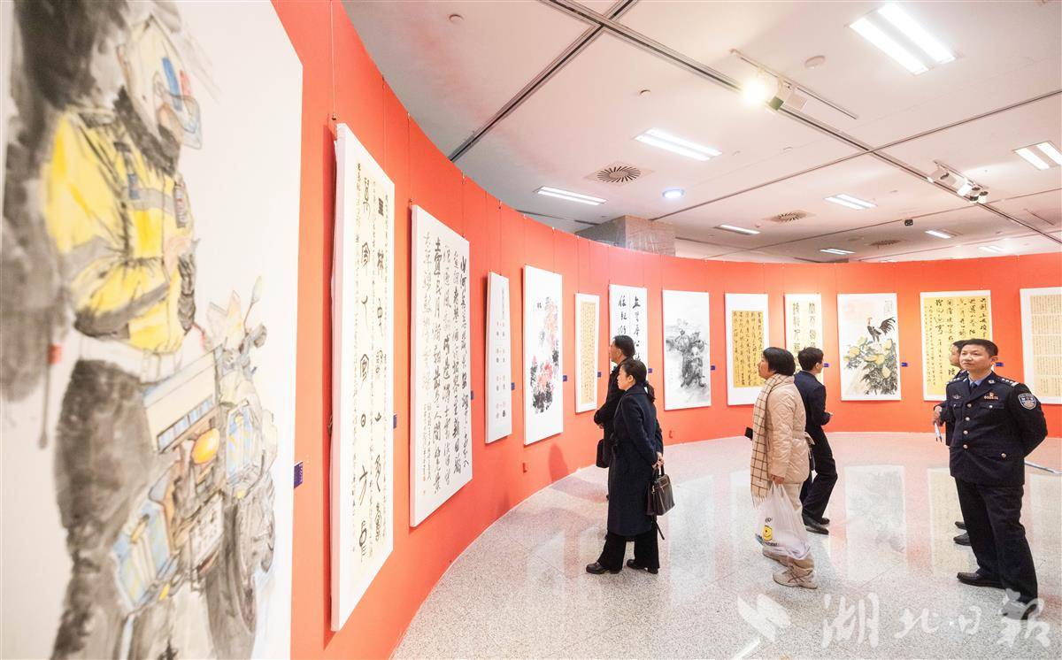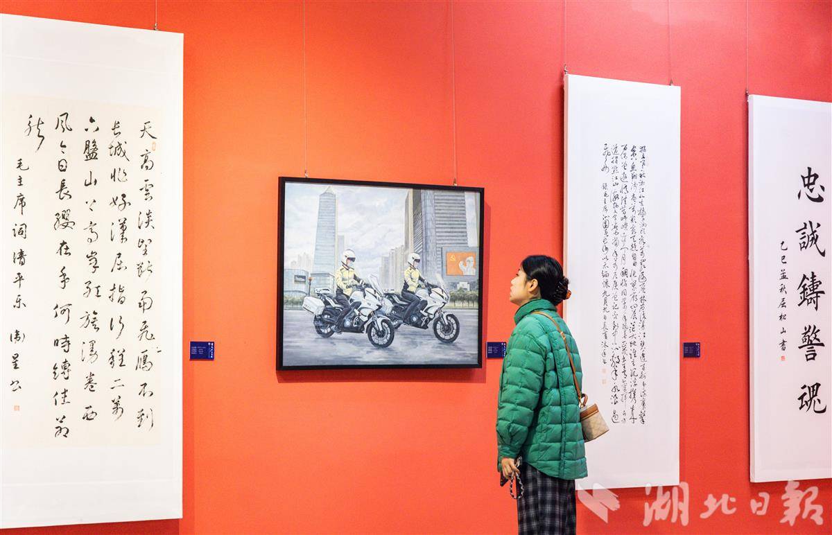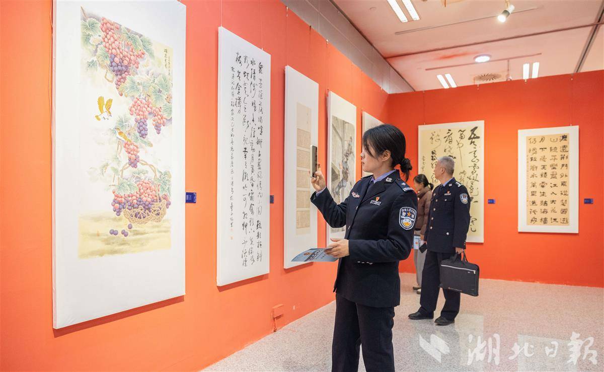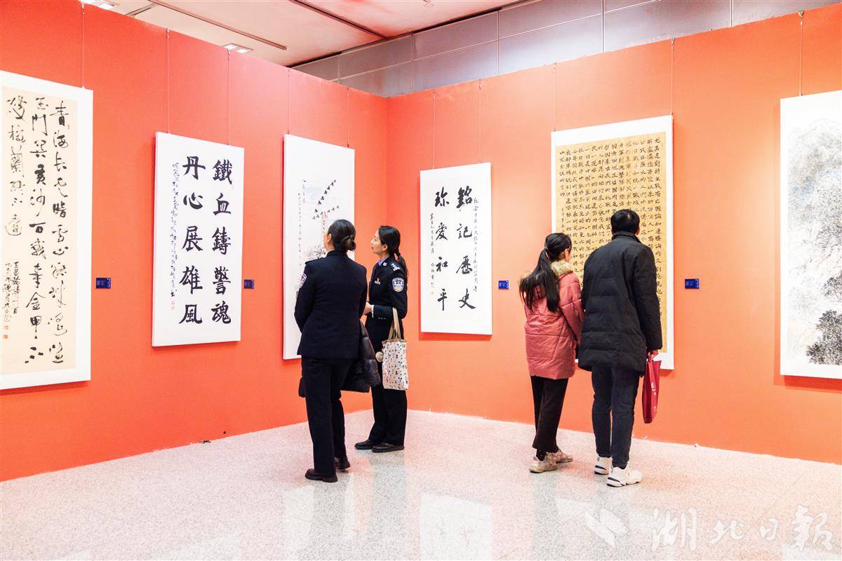 12月13日,湖北省图书馆,由湖北省公安厅主办的湖北公安机关“阳光下的守护”书法美术摄影展开幕,195幅优秀作品整齐陈列,吸引众多群众驻足观看。