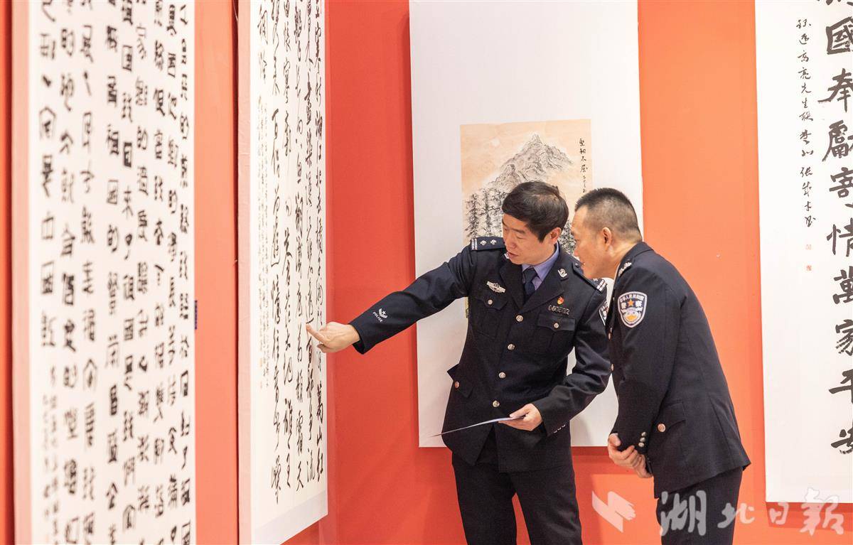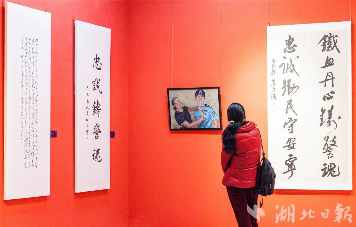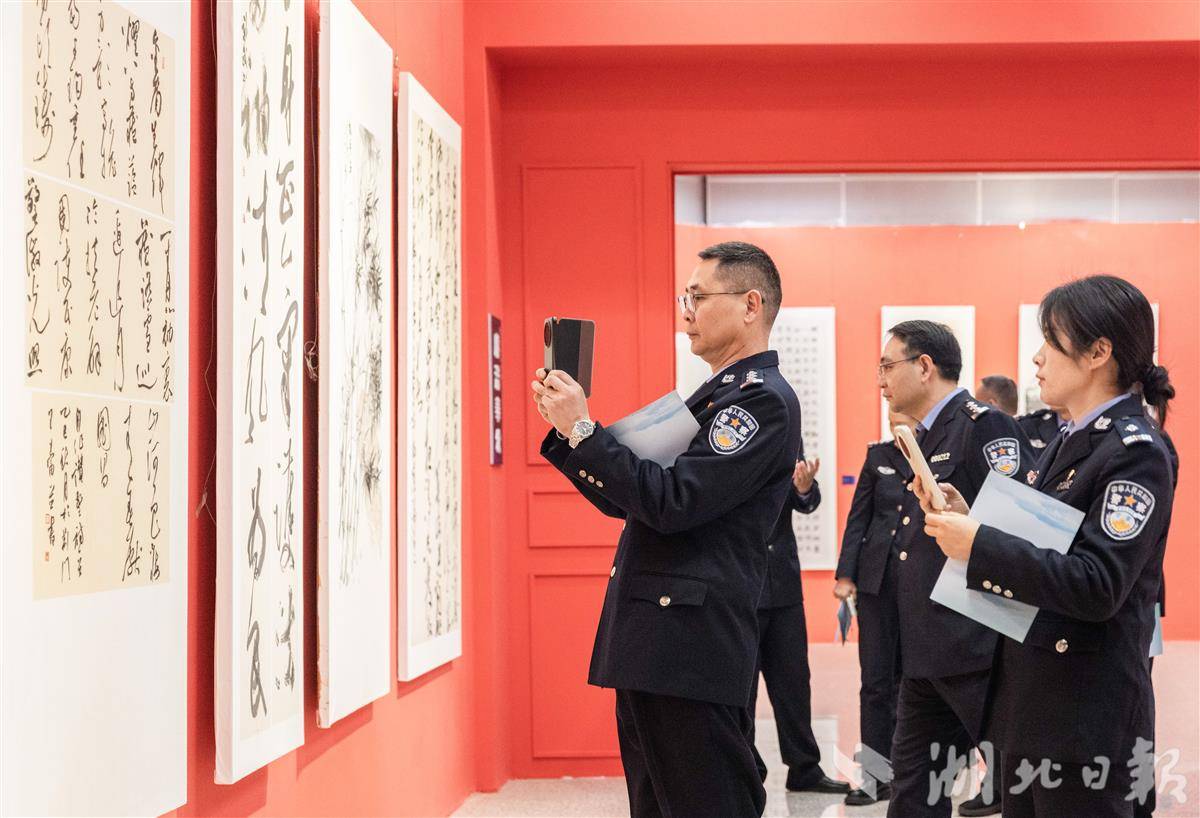 展览现场,一幅幅书画力透纸背、饱含深情,一个个瞬间定格真实、直抵人心。这些作品深刻反映了近五年来湖北公安机关深入学习贯彻习近平法治思想的生动实践,彰显了全省公安民警在抗洪水、战冰雪以及深化警务运行机制改革、常态化扫黑除恶、毒品清剿攻坚、民生案件大会战中忠诚担当、攻坚克难的精神风貌,凝聚了警民同心正能量。
