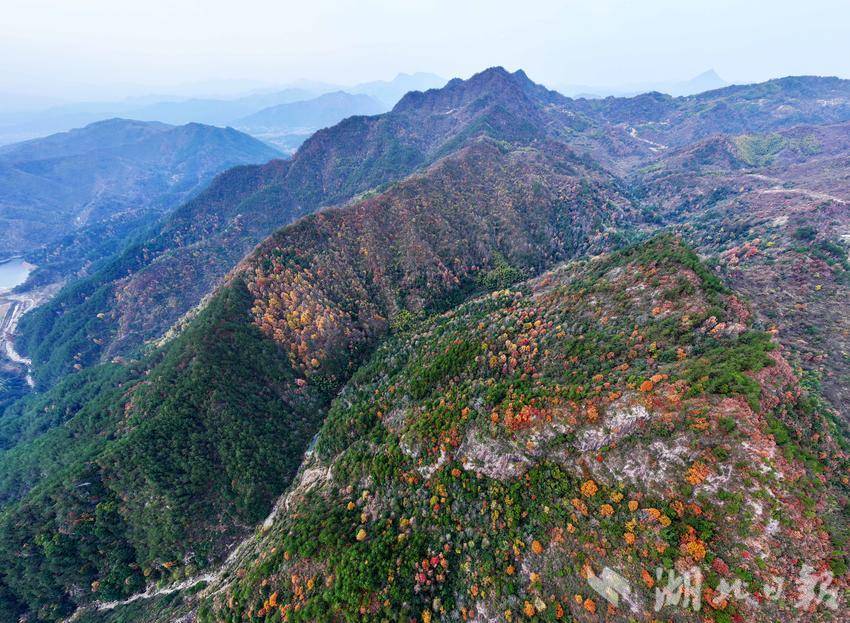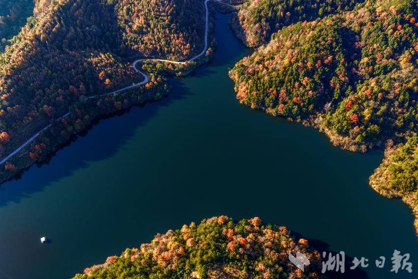 漫山红叶层层叠叠、色彩斑斓,深红、艳红、橙红交织错落,与峡谷间的青山碧水相映成趣,勾勒出一幅雄浑壮美的秋日山水画卷。