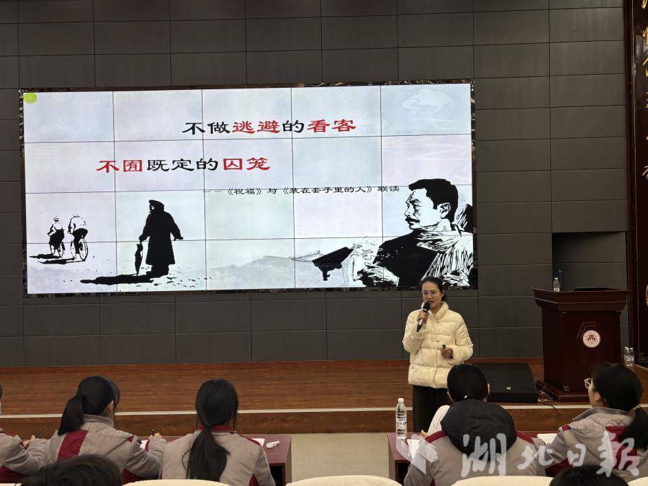 本次活动分为展示课和专题报告两个部分。首先,工作室荆州中学林静团队成员高雯婕老师执教群文阅读课《不做逃避的看客,不囿于既定的囚笼》。她创新融合《祝福》与《装在套子里的人》,以“在经典文本中镜鉴懦弱,于思辨交锋里唤醒担当”为主线,通过“解锁人物切片—代入情境思辨—叩问创作深意—联结现实反思”四个环节,引导学生剖析“我”与“我们”的内心图景,在“谴责还是同情”的思辨中唤醒自觉,推动学生从“文本中的他人”走向“生活中的自我”,实现精神成长的深度对话。