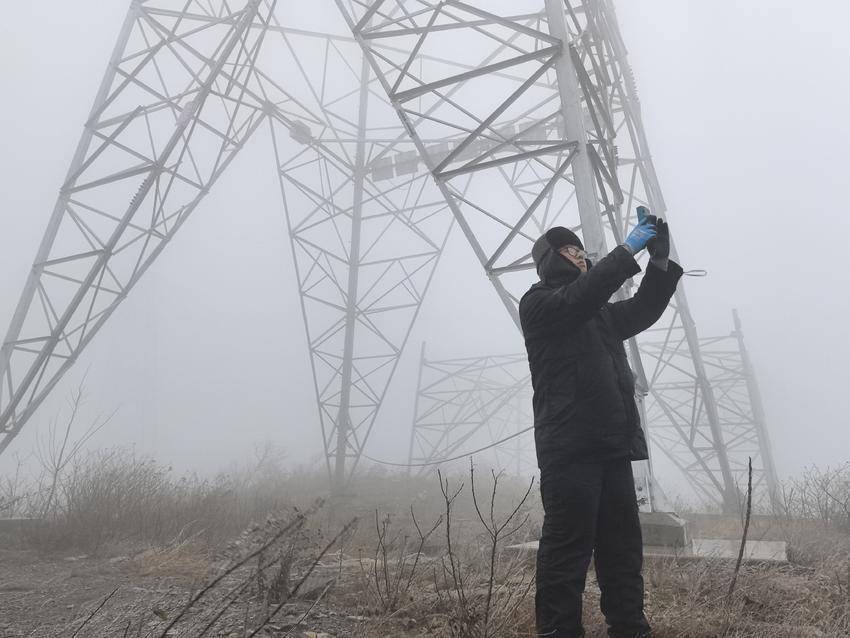 15点,空中雾气弥漫,方畅仔细观测模拟线路覆冰情况,李甫轩则手握风速仪测量风力。“线路未见覆冰倾向,绝缘子未覆冰。”两人及时传回观测数据。