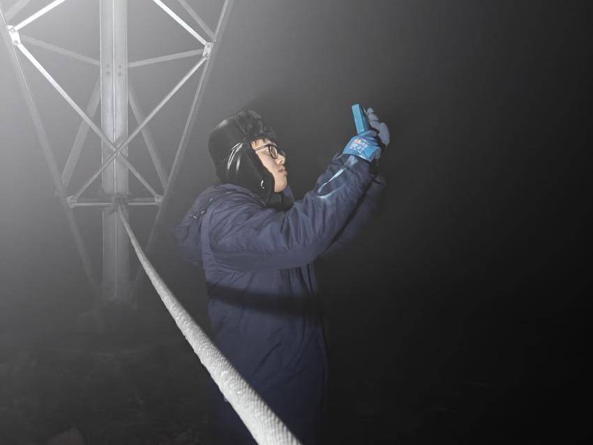 12月12日,寒潮来袭,气温骤降,荆门市东宝区圣境山顶的220千伏爱南线迎来严峻挑战。为获取该线路覆冰信息,荆门供电公司迅速组织运维人员开展冰情值守观测。