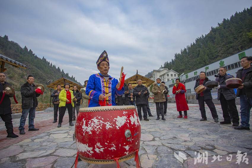 湖北日报客户端讯(通讯员陈功龙)初冬时节,巴东县东瀼口镇羊乳山村广场上锣鼓铿锵、唢呐嘹亮。三十余位村民手持鼓、锣、钹、镲和唢呐,整齐列队,奏响具有浓郁乡土气息的《迎亲调》。钹镲翻飞,锣鼓激昂,唢呐声穿透山岚,中间一面红漆大鼓击打出沉稳如心跳的节奏——这是巴东州级非物质文化遗产“八吹八打”的日常演练场景。乐声一起,便引来村民们驻足围观,随着节拍鼓掌应和。