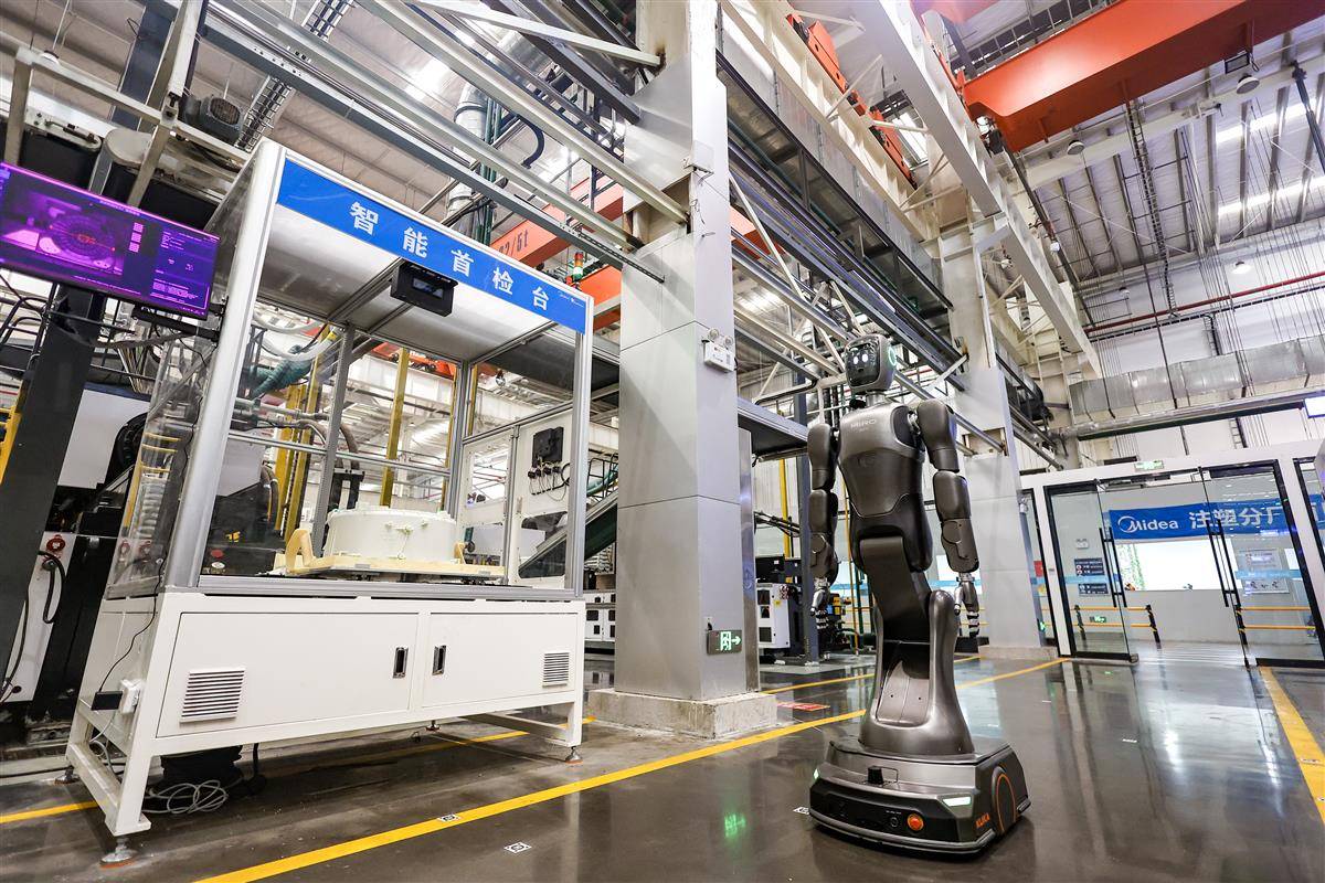 在美的洗衣机荆州工厂,第一代类人形机器人美罗已“上岗”超半年,成为生产线不可或缺的“常驻员工”。在“工厂大脑”的统一调度下,美罗们可自如穿梭于设备之间,稳稳搬运9公斤重的洗衣机后桶,精准完成3D质检、设备巡检、钣金上料等任务。