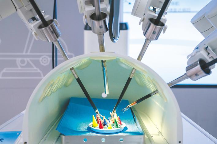 湖北“尖刀”技术攻关项目成果展上,联影集团展示的新型国产手术机器人。(湖北日报全媒记者 魏铼 摄)