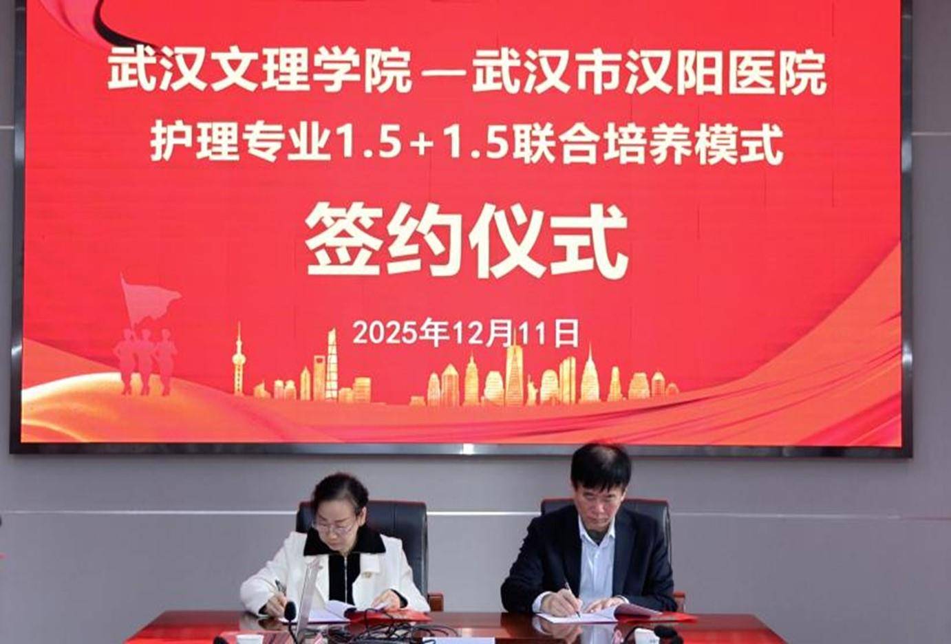武汉文理学院与汉阳医院签署护理专业1.5+1.5联合培养协议,杨灼芳、姜琼代表双方签约。