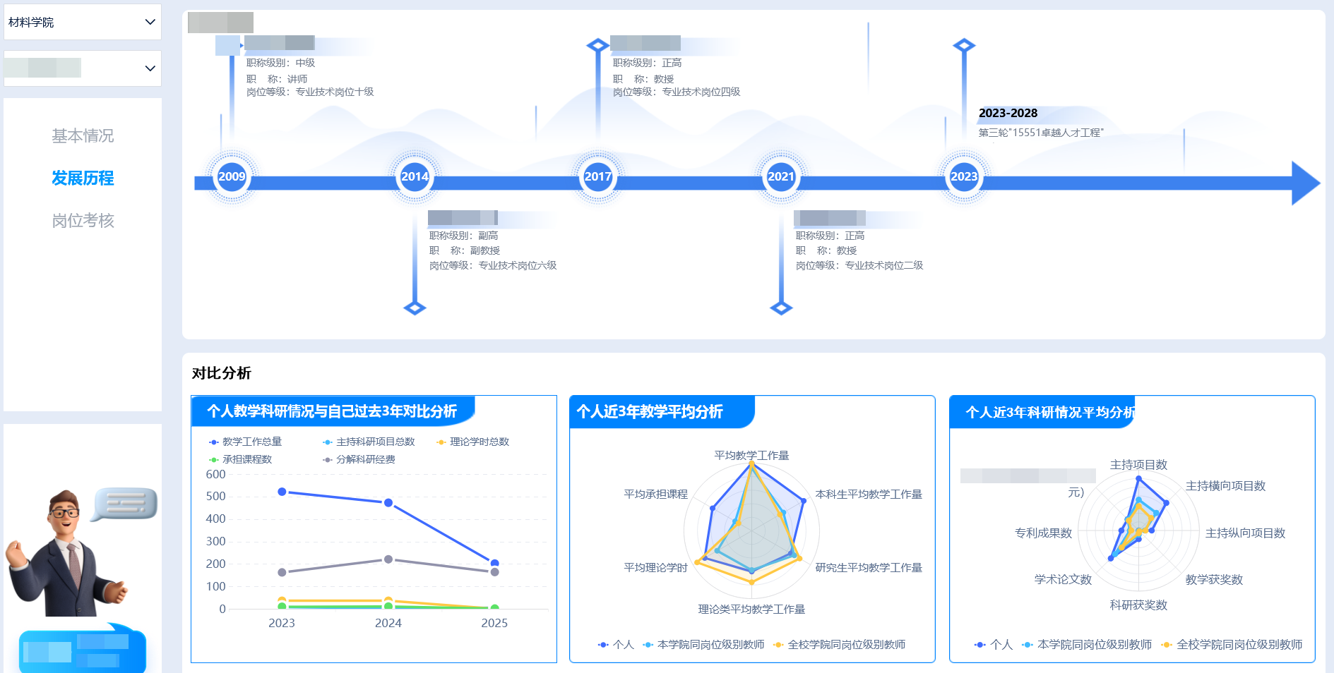 开发建设AI教师画像系统,实现对教师教学、科研、资源配置等数据基本问数和智能分析。“教师能力画像系统,汇聚教师基本信息,建立教学科研等业绩对比模型,科学打造围绕学科认可度、影响度和贡献度,以创新能力、质量、实效、贡献为导向的教师评价体系,全面实现人事管理服务数字化转型与智能化升级。”人事处负责人表示。