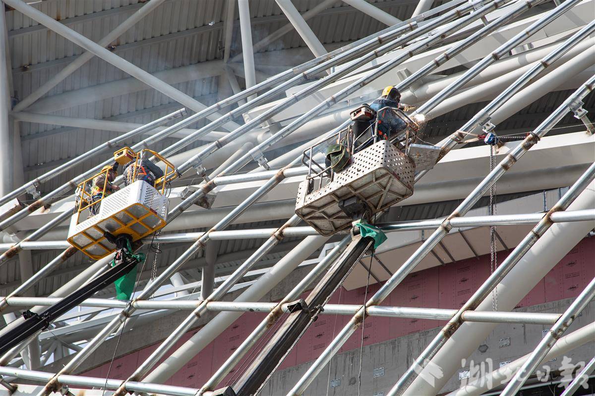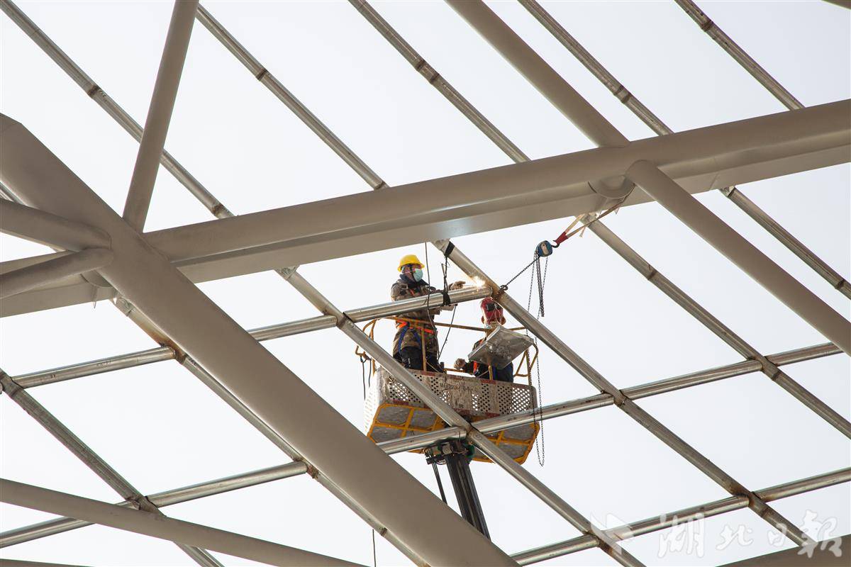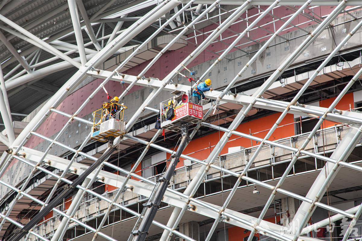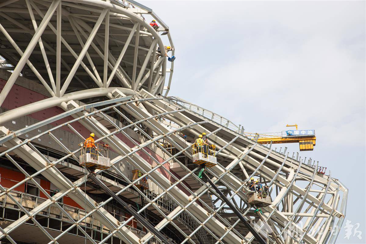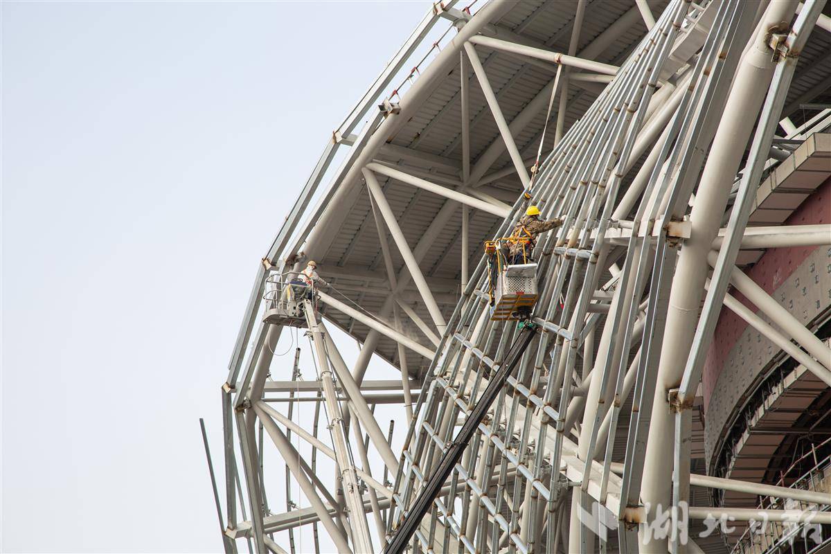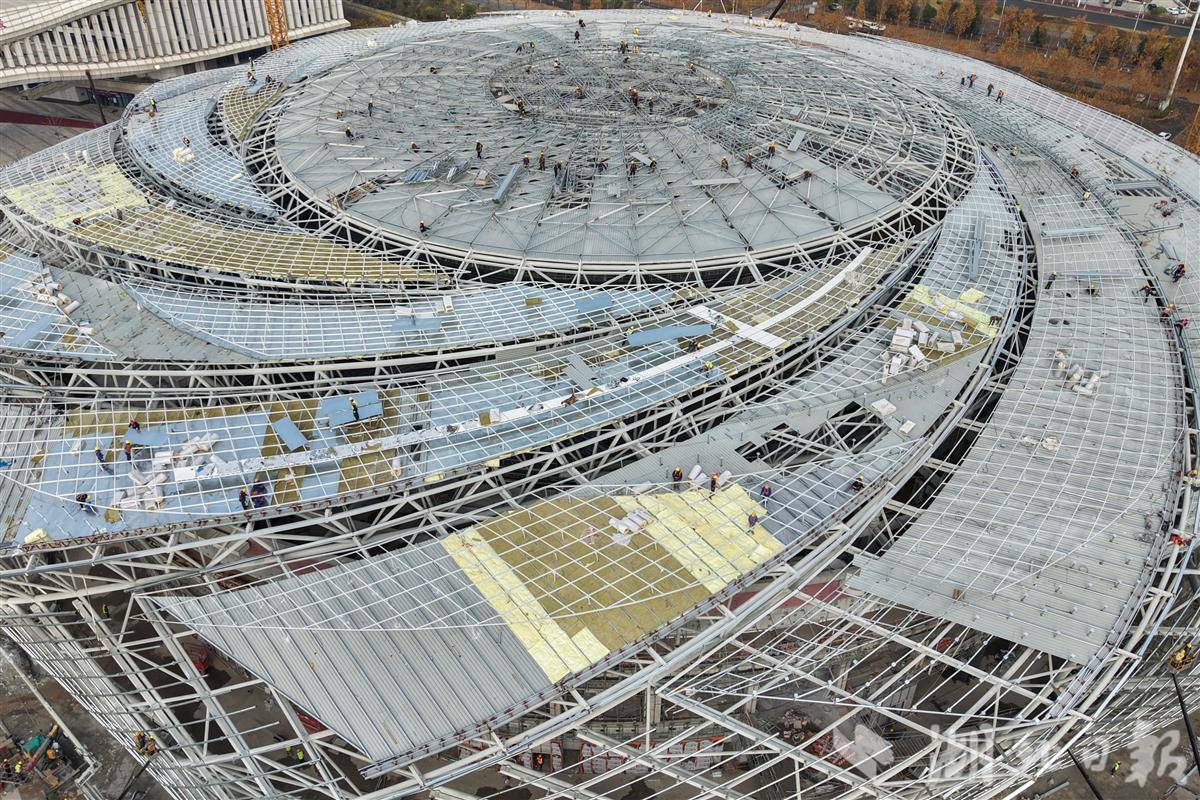 12月13日,施工人员在中国乒乓球队黄石训练基地赛训一体馆进行外立面幕墙安装施工作业。由中国一冶承建的中国乒乓球队黄石训练基地(大冶湖基地)是黄石市重点项目,该项目总建筑面积近14万平方米,总投资约为11.03亿元。由乒乓球赛训一体馆、体育运动学校、体育科研大楼、运动员接待中心4个单体组成,项目建成后将进一步擦亮黄石“乒乓名城”这张靓丽的名片。其中,赛训一体馆可容纳1万个观众席位,不仅具备承办乒乓球、篮球、排球、体操等国际顶级赛事的雄厚实力,还可用于举办文艺演出和大型展会,功能多样。