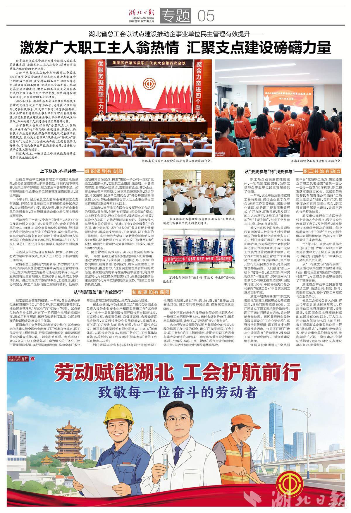 2025年以来,湖北省总工会以企事业单位民主管理规范提升试点工作为抓手,通过强化组织领导、完善制度体系、激发职工参与、培育典型引领,探索具有湖北特色的企事业单位管理效能提升路径,推动基层民主建设在企事业单位领域形成生动实践,为加快湖北支点建设持续汇聚磅礴力量。
