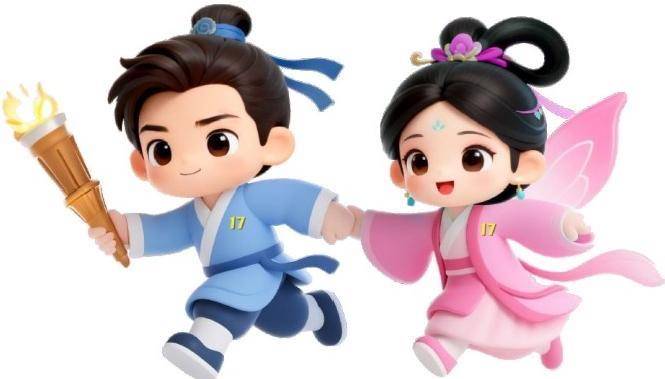 吉祥物设计灵感来源于孝感国家级非物质文化遗产《董永与七仙女》中“槐荫为媒”的经典传说。形象融合了董永的淳朴坚韧与七仙女的灵秀神韵,通过艺术化提炼,呈现为一对朝气蓬勃、向前奔跑的卡通角色,既体现“发展体育运动、增强人民体质”的宗旨,也传递了健康活力、积极向上的新时代体育精神。