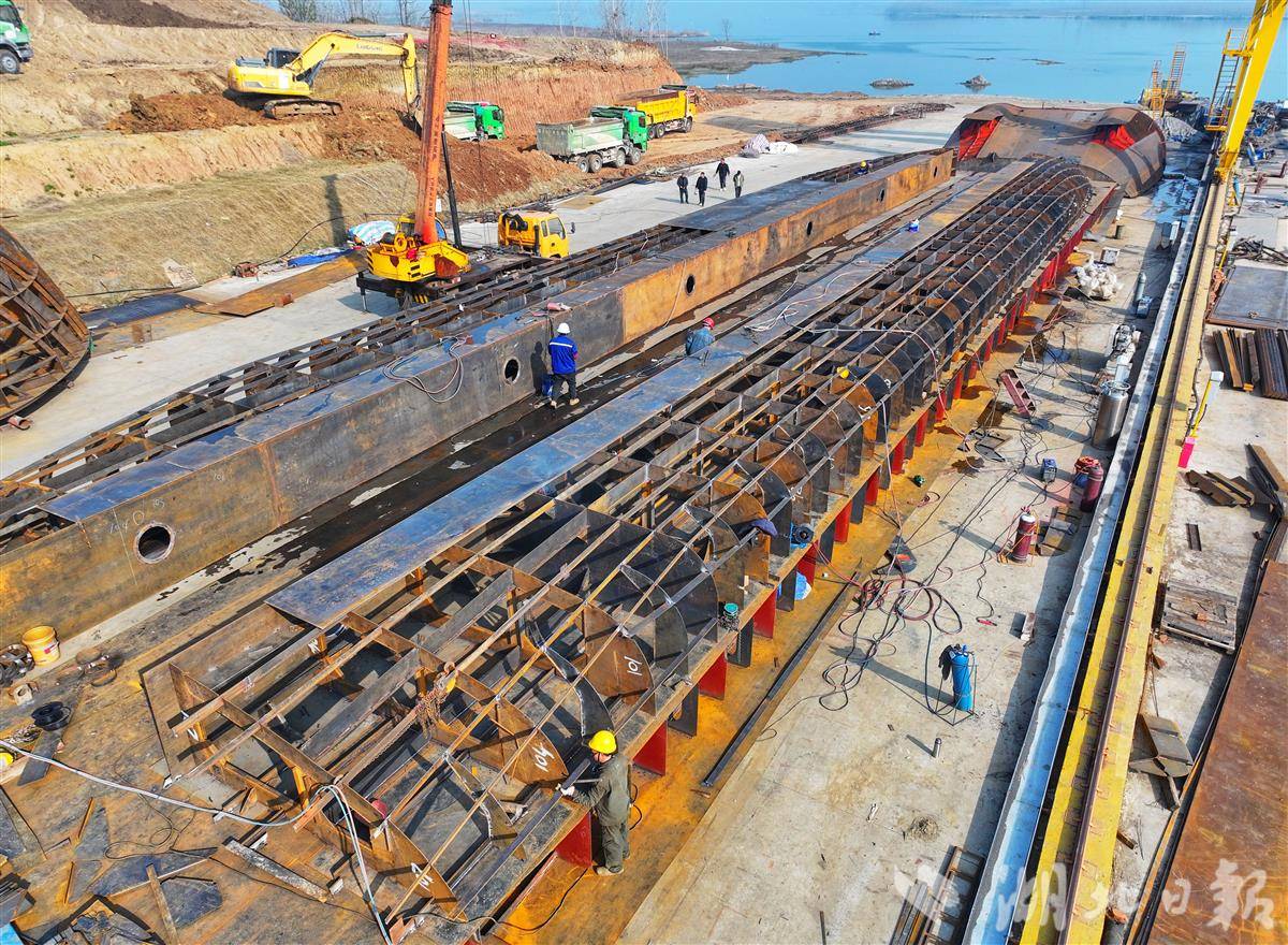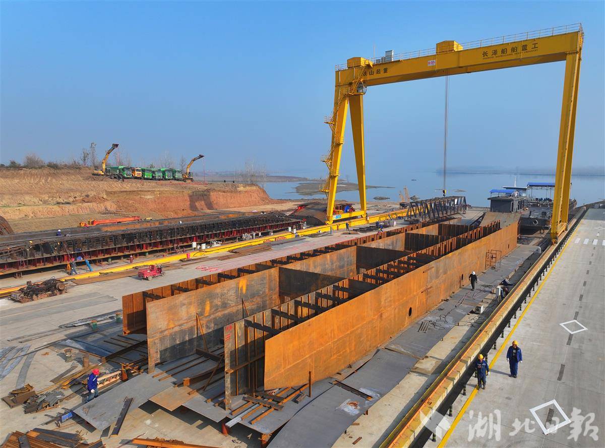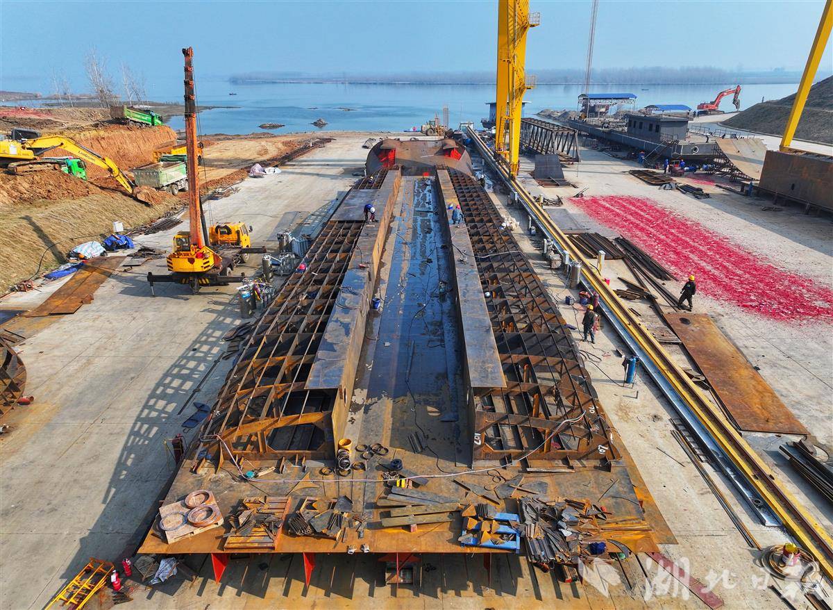 12月16日,湖北长泽船舶重工智能绿色船舶制造基地一期项目竣工暨汉江流域首批LNG动力新能源船舶开工仪式在襄阳小河临港经济区举行。当天集中开工的首批船舶包括1艘69米自卸船和2艘88米集散两用船,均为LNG单一燃料动力船舶,具备绿色、智能、标准化等特点,填补了鄂西北地区绿色船舶制造的空白。基地依托小河港的多式联运优势,聚焦绿色船舶研发、制造、维修一体化,助力汉江流域实现更高效、低碳、安全的航运发展。(视界网 谢勇 摄)