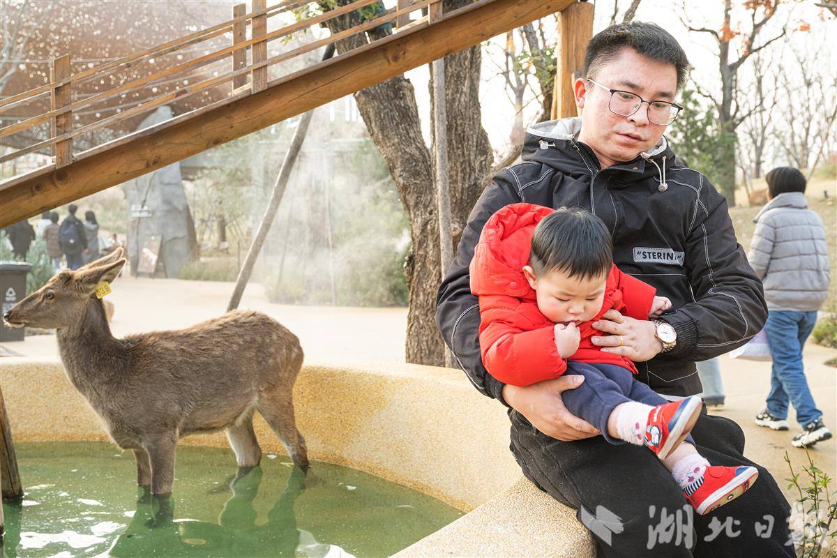 12月16日,一名家长抱着孩子与小鹿合影。(湖北日报全媒记者 任勇 通讯员 王谦 摄)