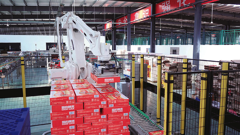 品源现代车间内,机械臂正在搬运打包完毕的香菇酱产品