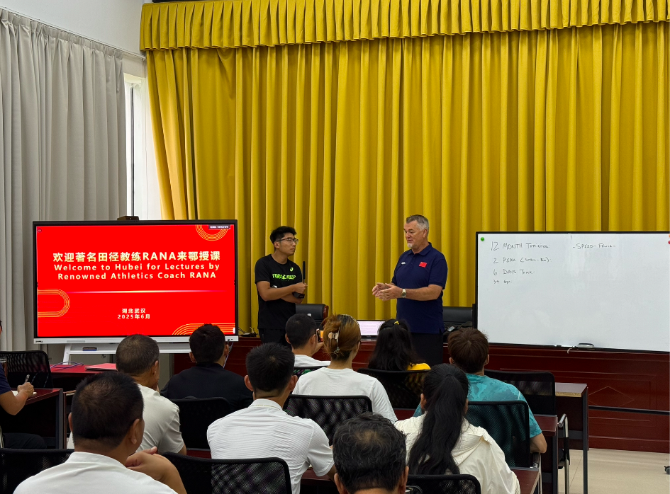 多元训练构建培养闭环。在选拔基础上,协会打造“普及-提高-拔尖”链条:2023年出台专项奖励,培养基层D级教练员约150人,培训裁判员及社会体育指导员2341人,选调1850人次执裁,夯实专业支撑。协会还结合湖北田径的优势项目,于2024年、2025年分别邀请特邀国际知名教练兰迪·亨廷顿和带出13块奥运金牌的雷诺,为省田径队教练和地市州体校、传统校、俱乐部教练授课。两位外教不仅分享了理论知识,还结合我省优秀短跑运动员作为案例进行实践剖析。通过青少年夏令营、精英训练营,以“省队教练带训+动态考核淘汰”模式,集中培训优秀苗子超百人,还承接全国短跑项目训练营。2025年开展全省青少年田径后备人才专题调研,优化“61530X”计划,提升培养精准度。