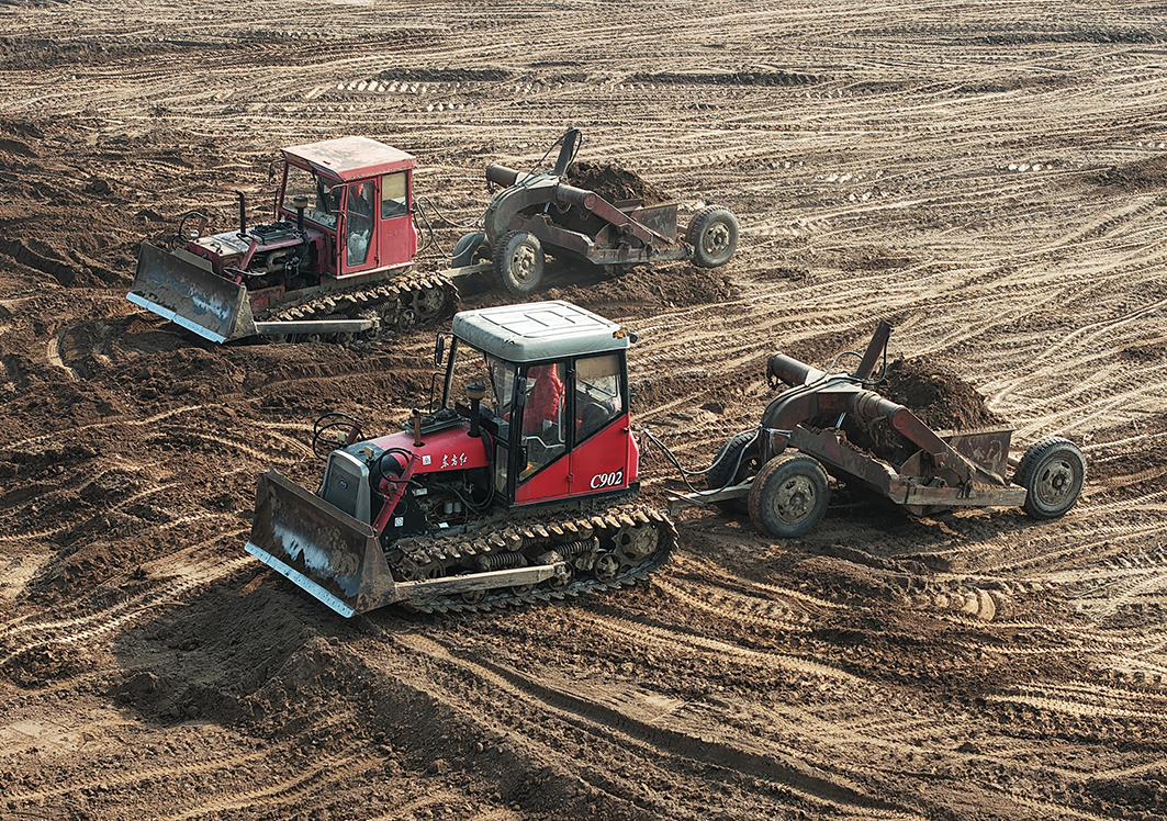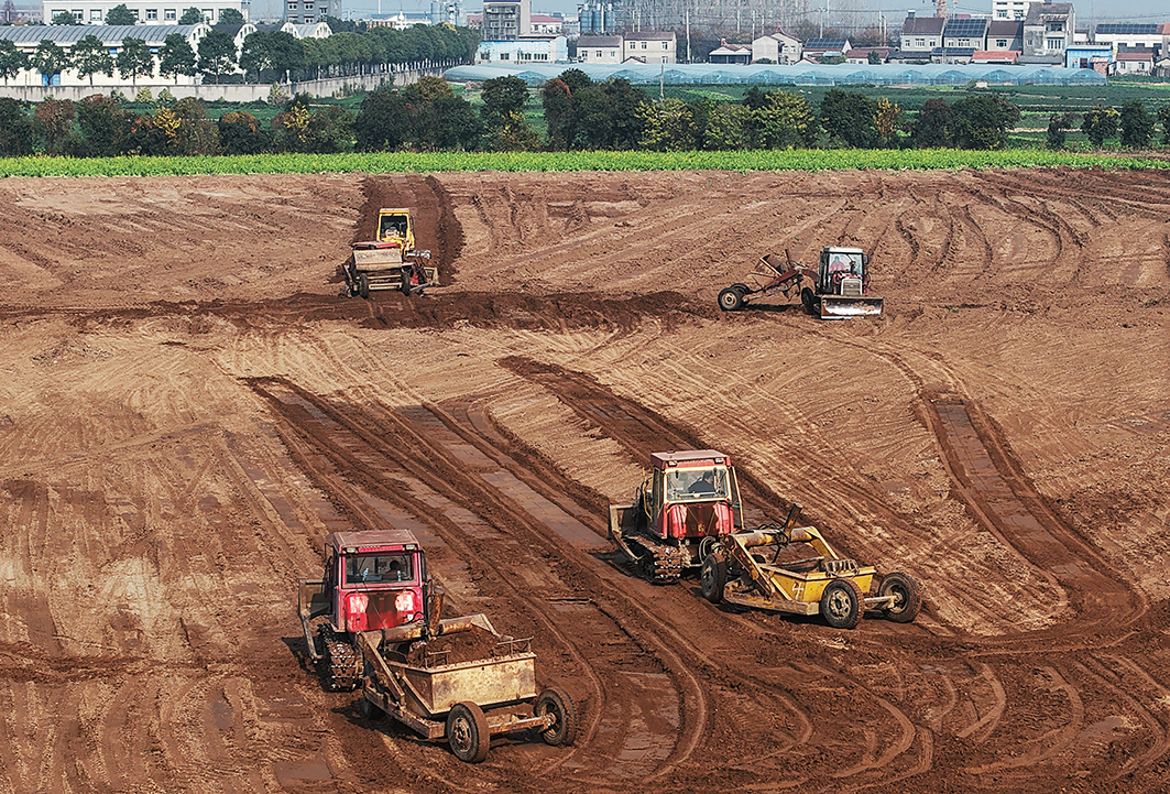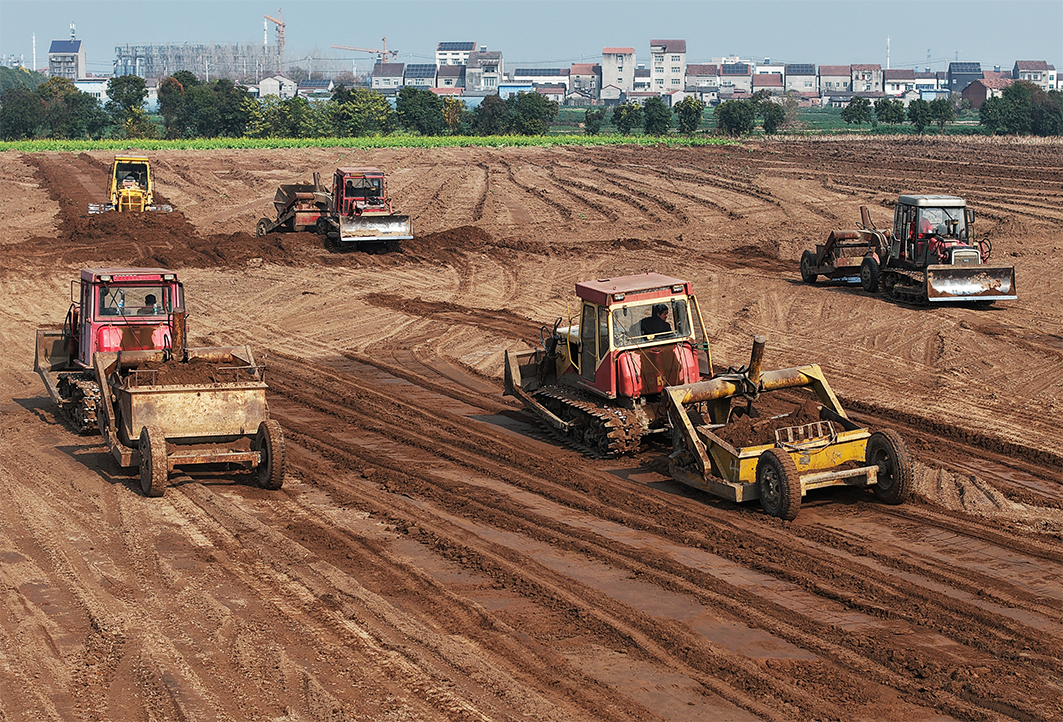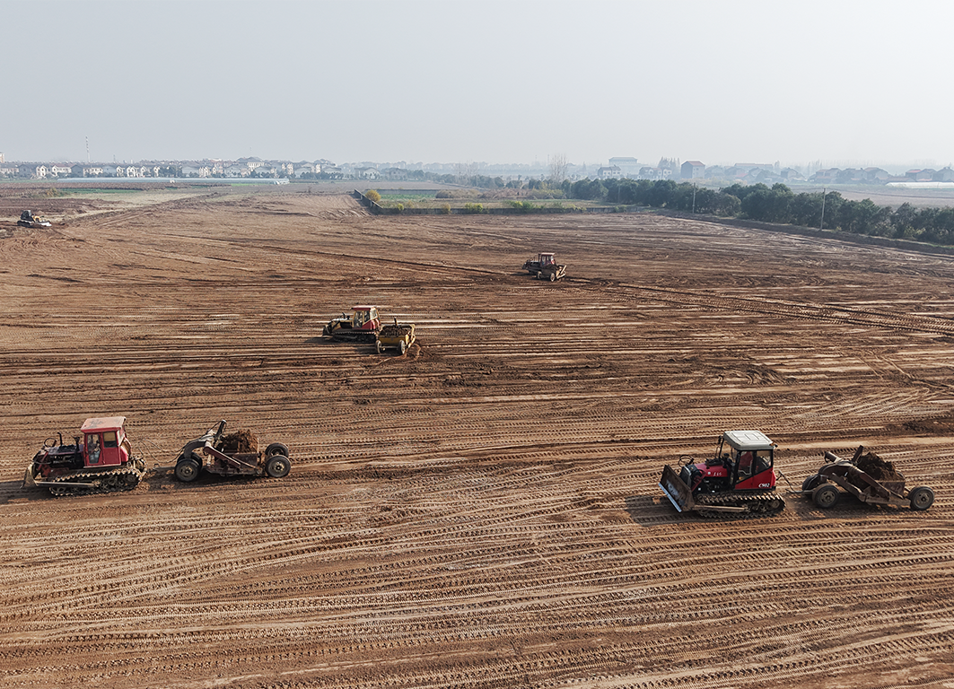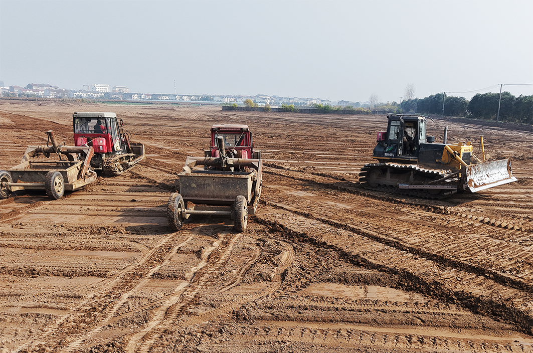 江陵县郝穴镇大兴村高标准农田建设项目现场,多台推土机和铲运机轰鸣着穿梭于田间,将高低错落的地块推平、压实。