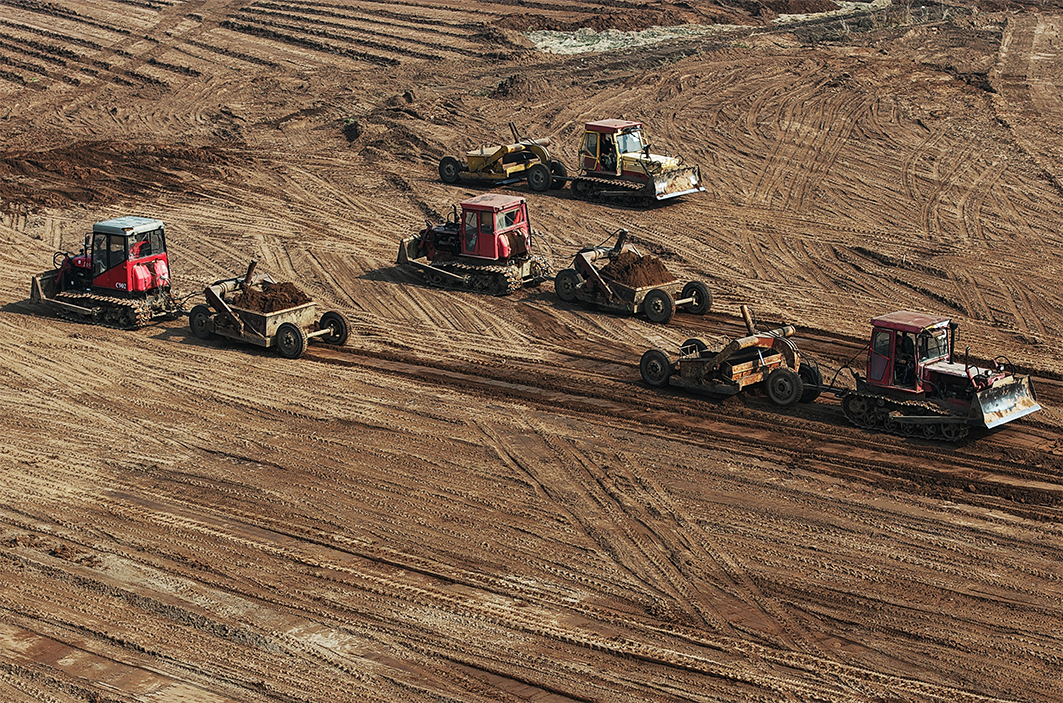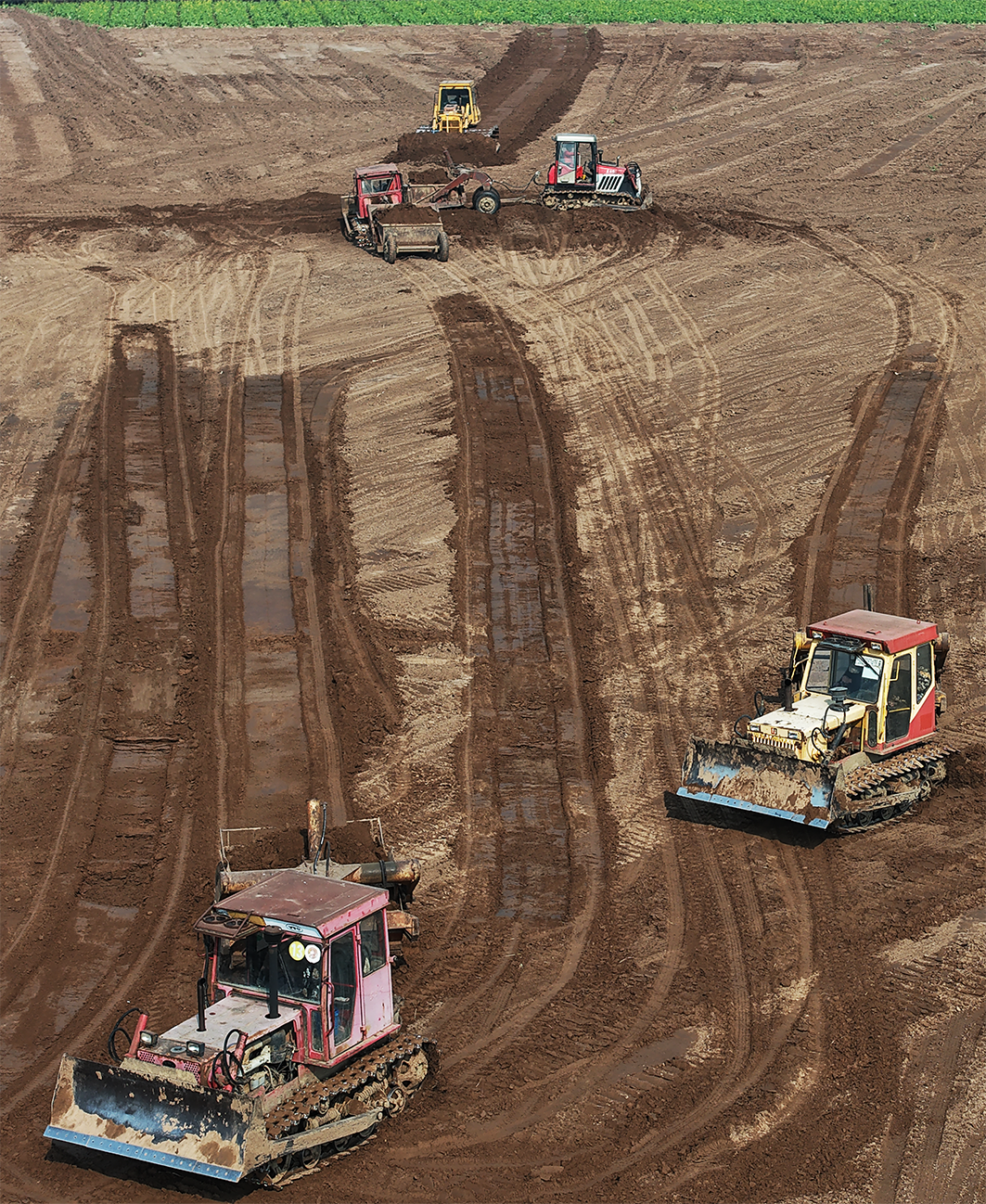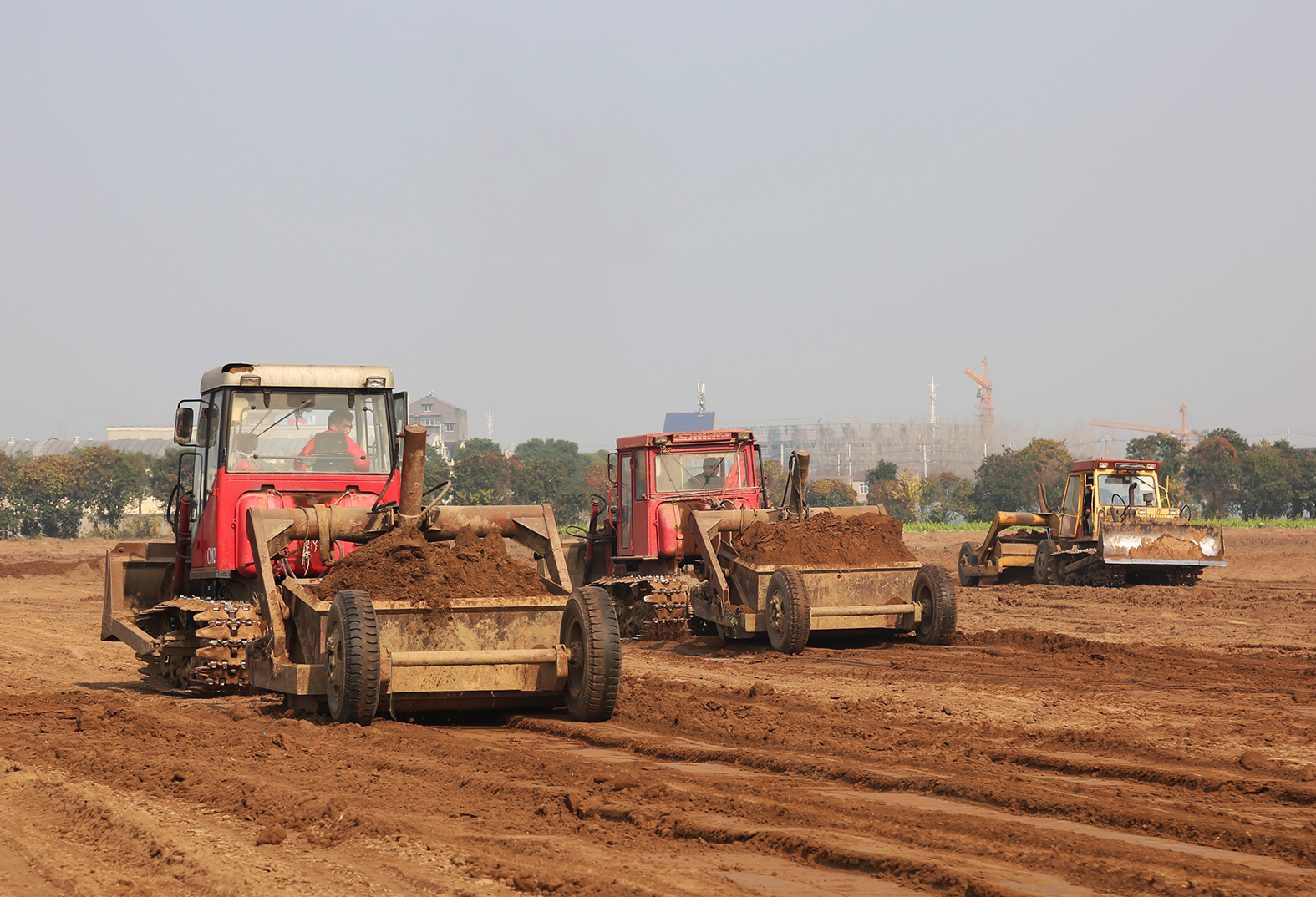 江陵县郝穴镇大兴村高标准农田建设项目现场,多台推土机和铲运机轰鸣着穿梭于田间,将高低错落的地块推平、压实。