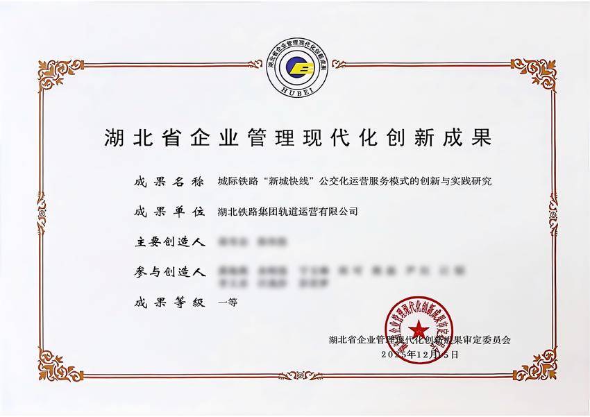 湖北日报讯 (通讯员宁玉琳、汪逸莎)近日,湖北省企业管理现代化创新成果评选结果揭晓。在全省336项参评成果的激烈角逐中,湖北铁路集团轨道运营有限公司申报的《城际铁路“新城快线”公交化运营服务模式的创新与实践研究》项目脱颖而出,荣膺一等奖。这份殊荣,是对公司管理创新实践的高度认可,更彰显了公司在城际铁路公交化运营赛道的领先地位与硬核实力。