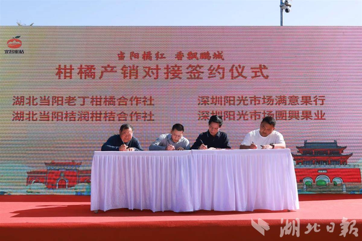 活动现场,深圳湖北宜昌商会和深圳阳光水果批发市场的2家企业,分别与当阳市长坂坡柑橘专业合作社联合社、当阳市桔润柑桔专业合作社、当阳市老丁柑橘种植专业合作社签订3.6万吨柑桔购销协议,签订金额达8000万元。