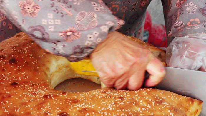 剁馍出炉时,是个又大又厚的圆圈,感觉都能当猫窝。饼皮有韧劲,芯子很软和,带着米酒发酵的甜香。