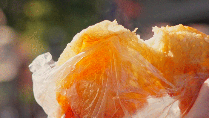 不用塑料袋装,就手拿着,先趁热吃掉脆底,再一点点揪下馒头。