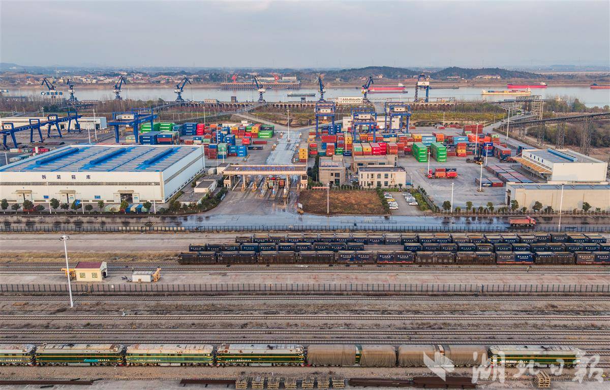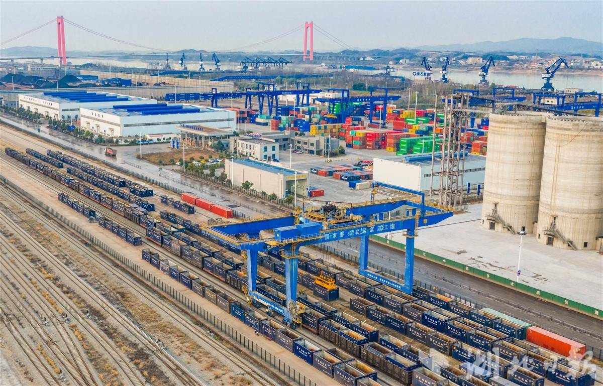 12月16日,黄石新港多式联运作业现场,铁轨旁集装箱整齐码放,龙门吊等设备有序运转,远处的跨江大桥和港口设施相互映衬,一派繁忙景象。