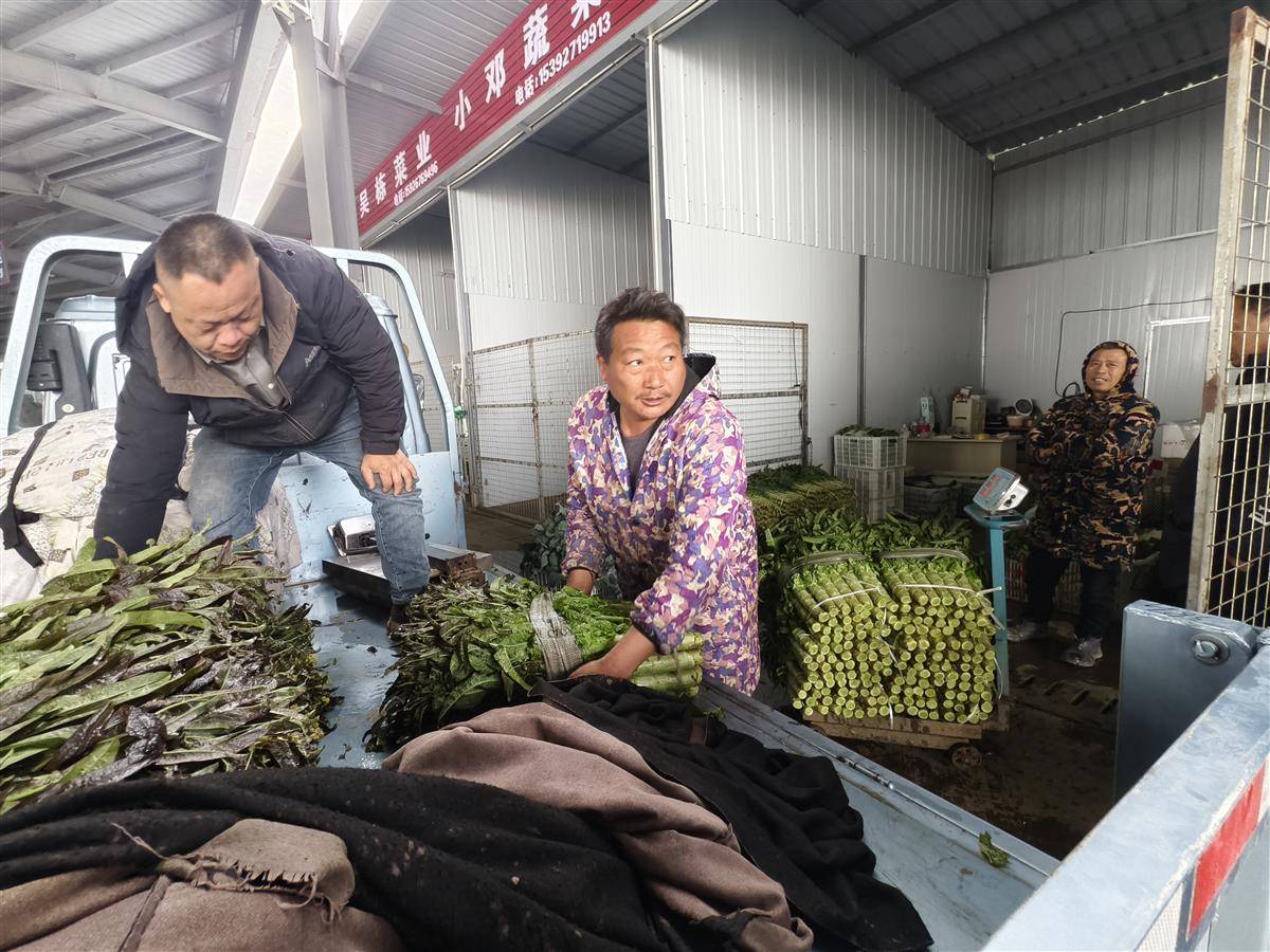 王亚兵(中)将新鲜的莴苣运到九江琵琶湖市场。(湖北日报全媒记者刘毅摄)