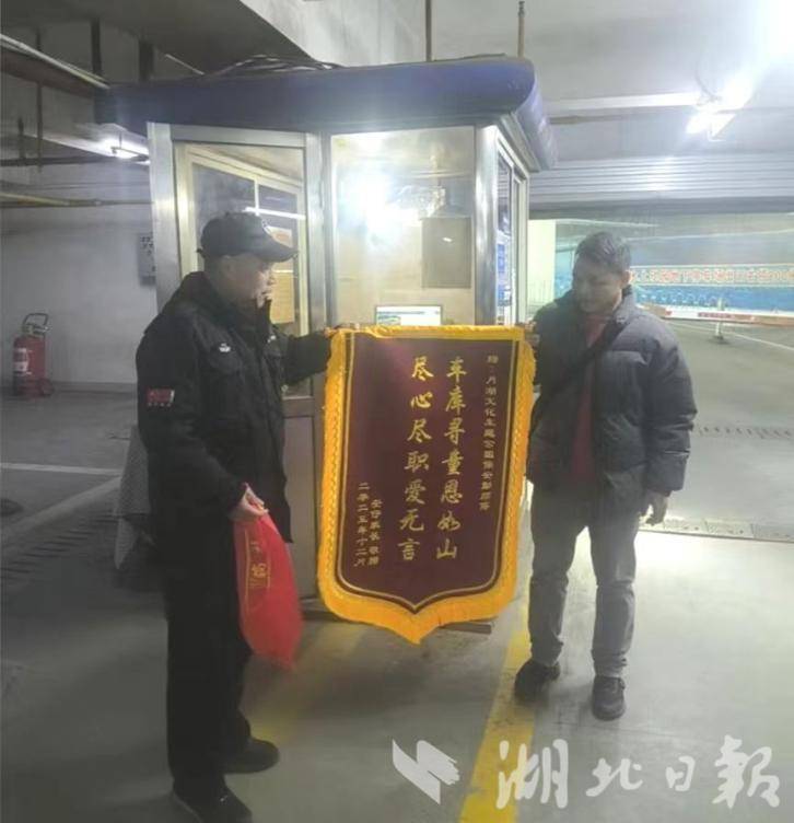 湖北日报讯(通讯员许华军、陶琼)12月18日上午9时,武汉汉阳月湖风景区地下停车场岗亭前,一对夫妻将一面写有“尽心尽职爱无言 车库寻童恩如山”的锦旗,郑重交到景区保安负责人手中,以此感谢四名保安此前帮助找回走失的4岁儿子。