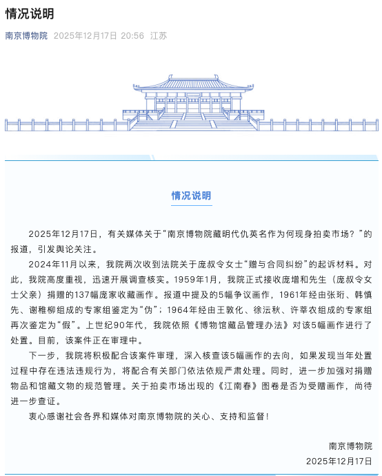 12月17日,有媒体报道“南京博物院藏明代仇英名作为何现身拍卖市场”,引发舆论关注。南京博物院回应称,将深入核查该5幅画作的去向,如果发现当年处置过程中存在违法违规行为,将配合有关部门依法依规严肃处理。同时,进一步加强对捐赠物品和馆藏文物的规范管理。关于拍卖市场出现的《江南春》图卷是否为受赠画作,尚待进一步查证。