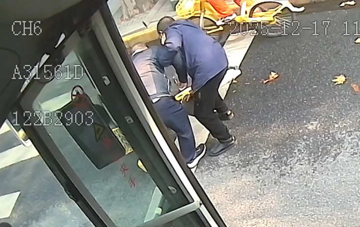 当时,潘贝正驾驶公交车行驶至此,突然发现前方机动车道上,一名骑共享单车的市民重重摔倒,多次尝试无法起身,处境危险。潘贝未作迟疑,立即安全停靠车辆,开启双闪,并向乘客简短解释:“耽误大家几分钟,我去帮一下。”