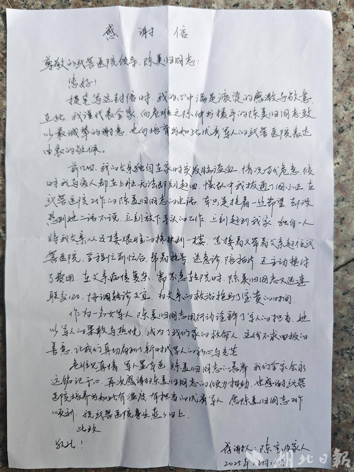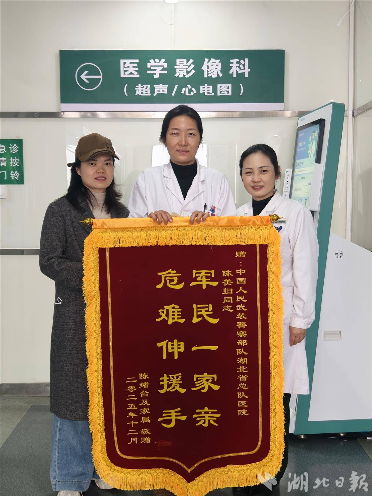 鉴于病情需要,医院迅速制定转院救治方案,无缝衔接推进转院事宜。因为送诊抢救及时,老人病情得到有效控制,身体逐步好转。之后,老人家属专程来到武警湖北总队医院,将一面锦旗送到陈美归及医院医护人员手中,感谢医院官兵医护的暖心举动。