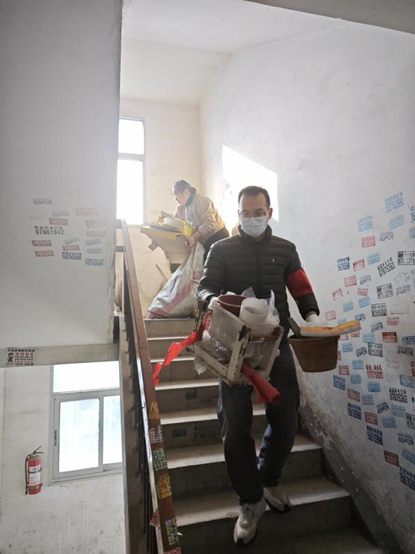 活动中,下沉党员充分发挥先锋模范作用,主动承担重活累活,带领志愿者分成6组开展“地毯式”清理。大家秉持“发现一处、清理一处”原则,徒手搬运旧家具、清运废旧纸箱,逐楼栋清理楼道垃圾及无人认领杂物。“别看这些东西不起眼,搬起来还挺重!”下沉党员张凯笑道。他往返上下楼搬运杂物十多趟,汗水浸透衣衫、沾满尘埃仍干劲十足;骆东丰则认真清扫搬运残留灰尘,即便灰尘呛鼻、灰头土脸也毫不在意。