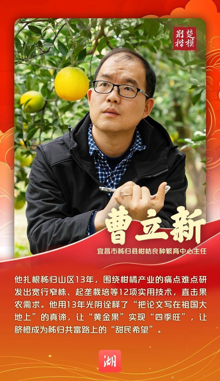12月18日,2025年度“荆楚楷模”名单发布,宜昌市秭归县柑橘良种繁育中心主任