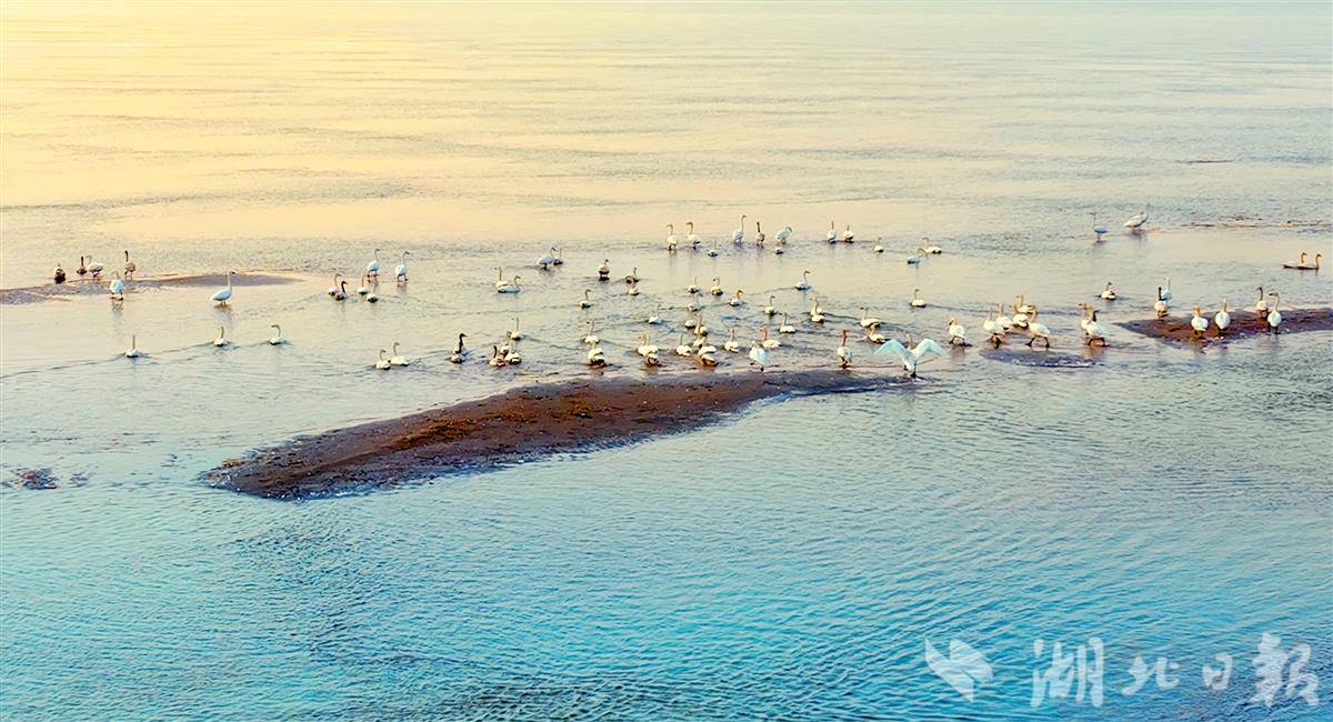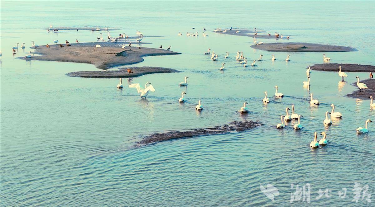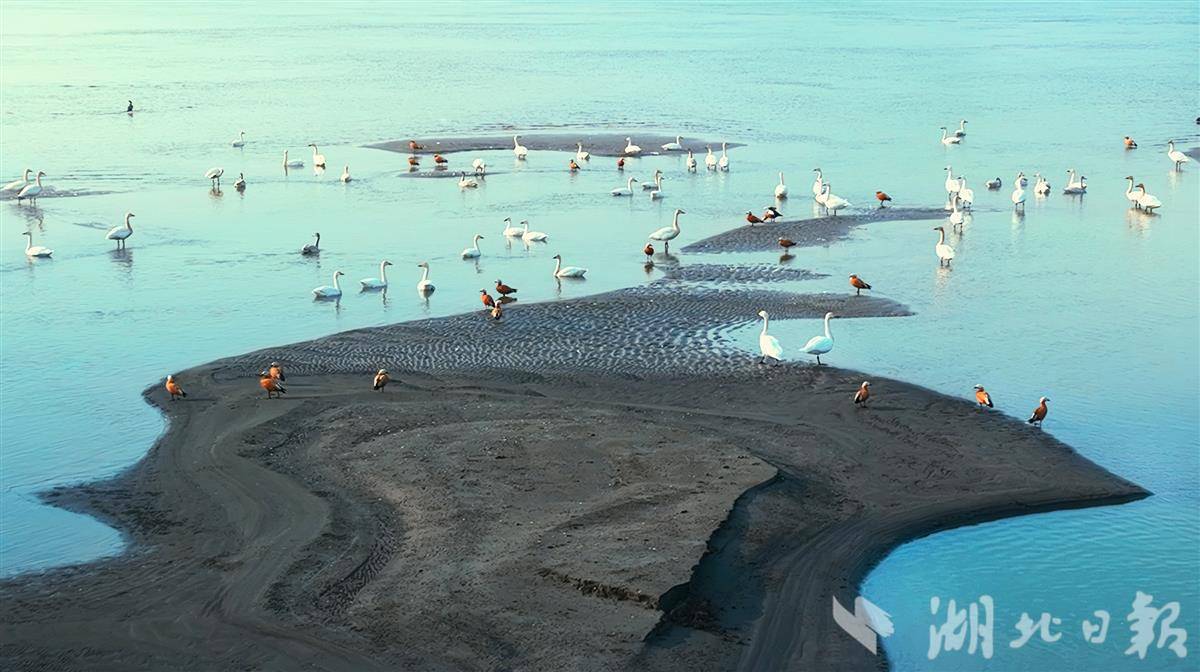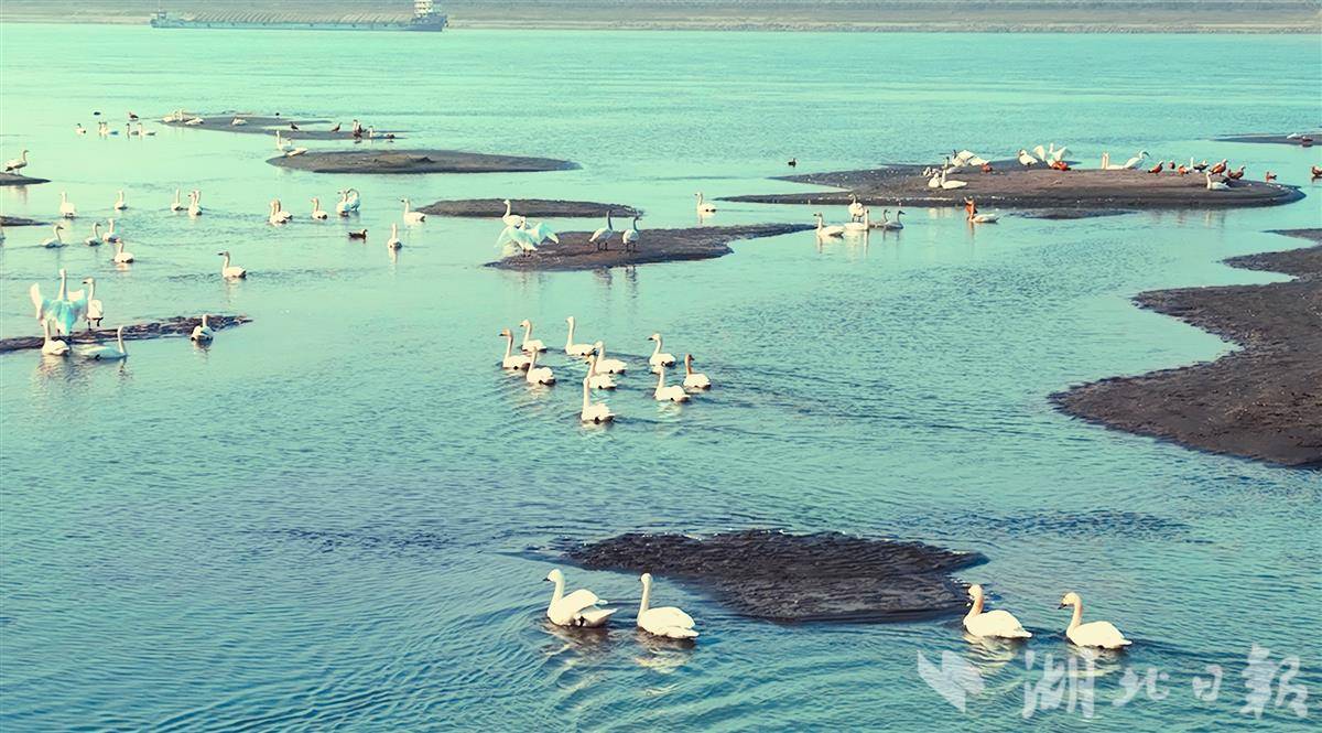 12月18日,鄂州市华容区芦花村旁的长江中,成群结队的天鹅、赤麻鸭等越冬水鸟或嬉戏、或飞翔、或在江中的滩头上休憩,成为当地一道亮丽且灵动的生态风景线。