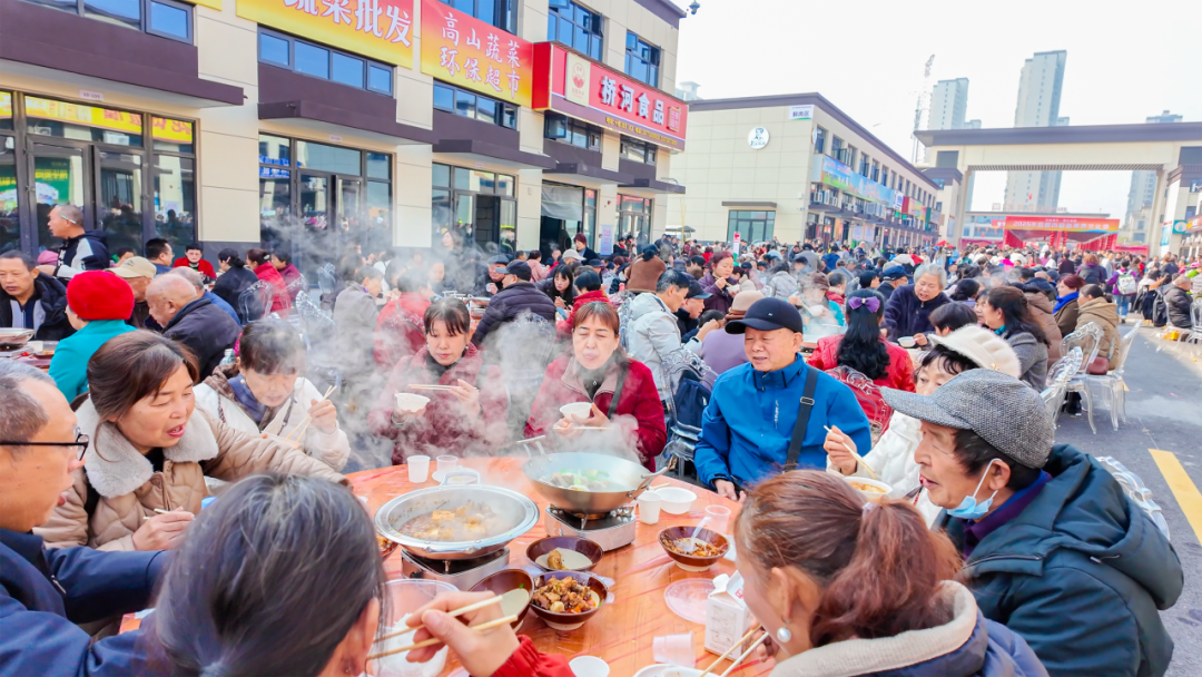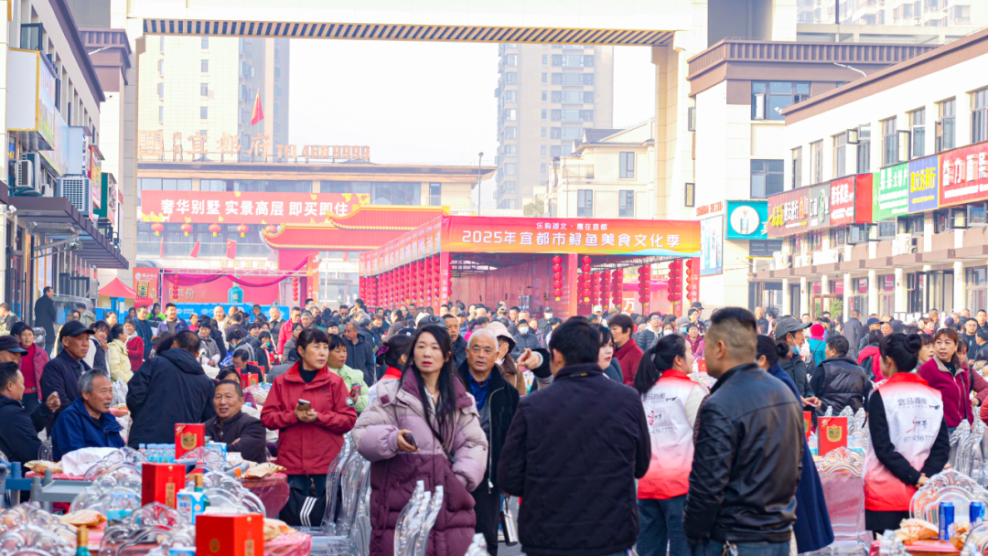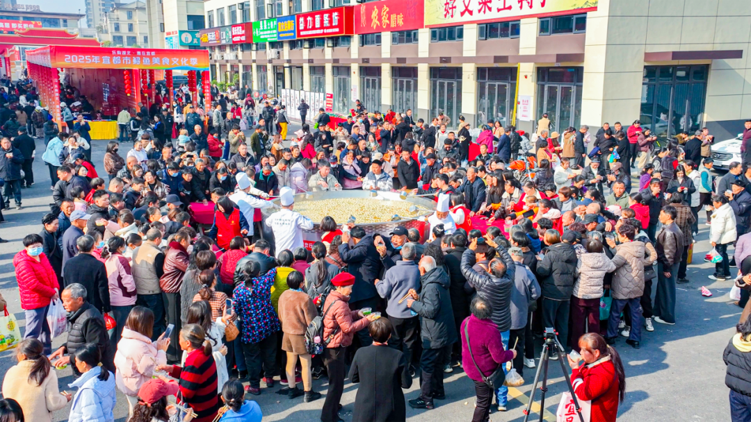 鲜香未散,另一场更具仪式感“千人长街宴”正式开席。桌上是满满的宜都风味,寓意丰饶圆满的传统“十碗八扣”、散发着浓郁的乡土气息的杀猪菜等宜都经典美食一一上桌。来自周边地区的游客们围坐一堂,筷子起落间,笑语欢声与杯盘轻响交织,编织出一幅活色生香的冬日民俗画卷。