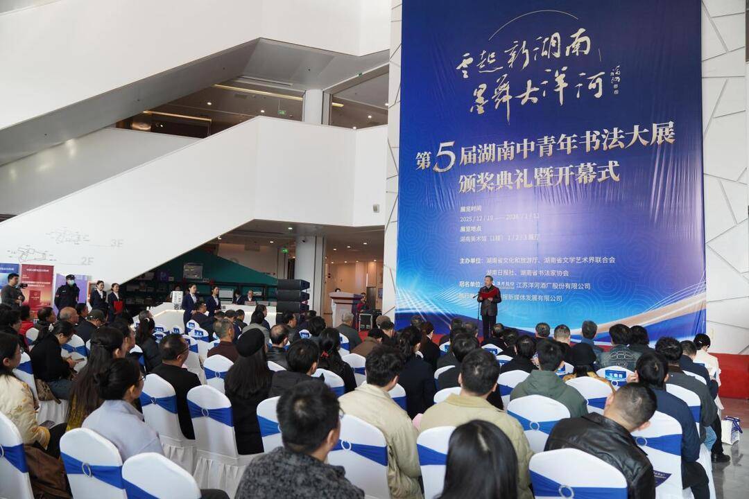 12月19日上午,“云起新湖南墨舞大洋河”第五届湖南中青年书法大展开幕式暨颁奖典礼在湖南美术馆举行。现场人气高涨,气氛热烈,展厅内外人头攒动,众多书法爱好者、文化艺术界人士及市民群众早早到场,共同期待这场湖湘书法盛宴。展览集中呈现202件形式多样、内容丰富的书法作品,为观众打造了一场精彩纷呈的艺术体验。“优秀奖”作者现场接受表彰。