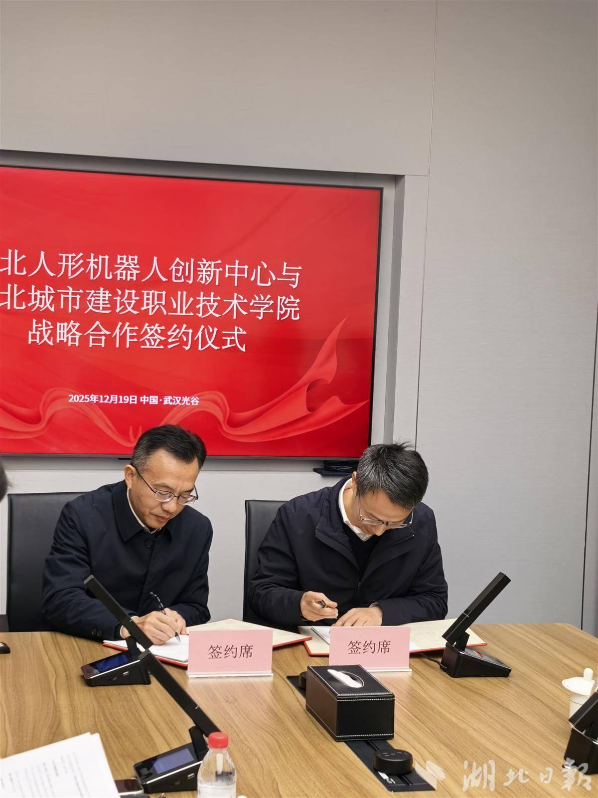 湖北日报讯(记者包东喜、通讯员邵卫、李夏、范朋颖)12月19日,湖北省科技投资集团及所属湖北人形机器人创新中心有限公司与湖北城市建设职业技术学院在东湖数字经济产业园举行战略合作签约仪式。