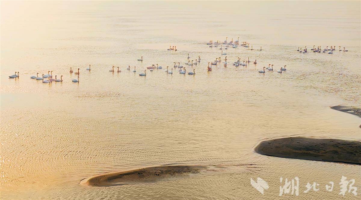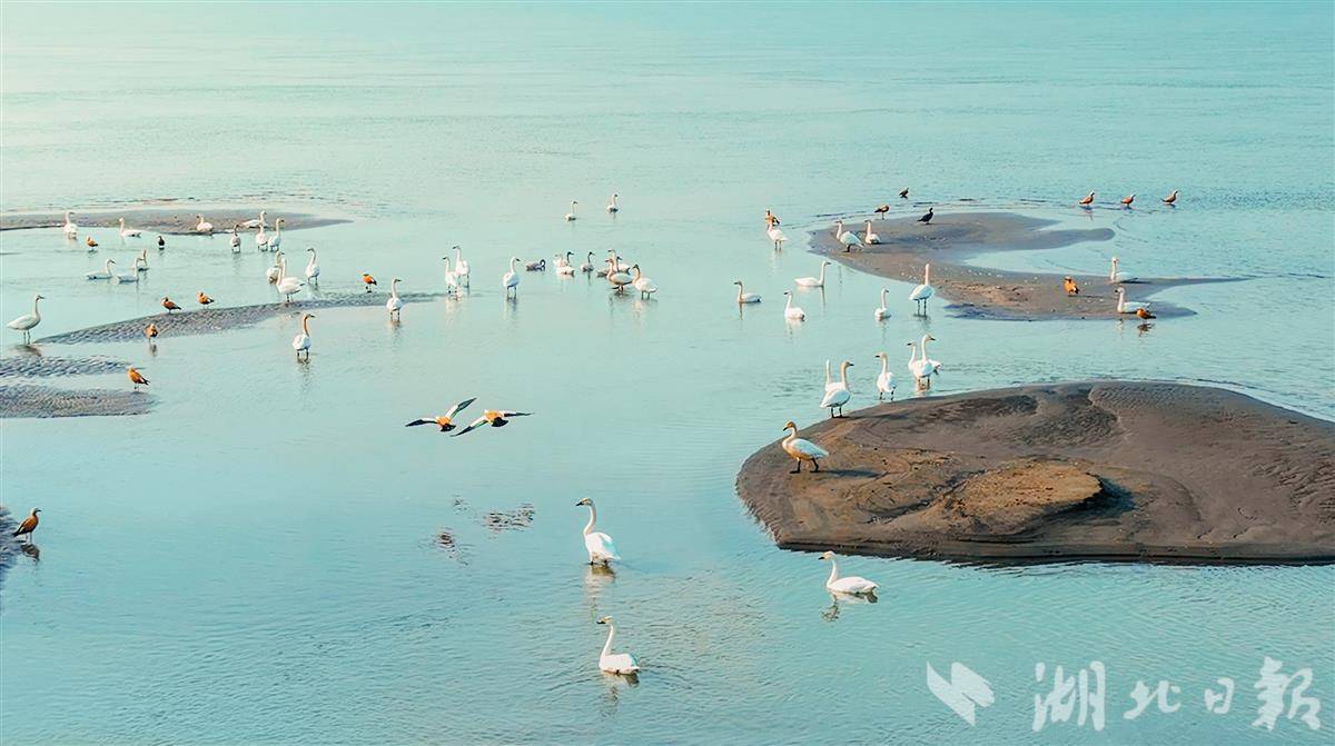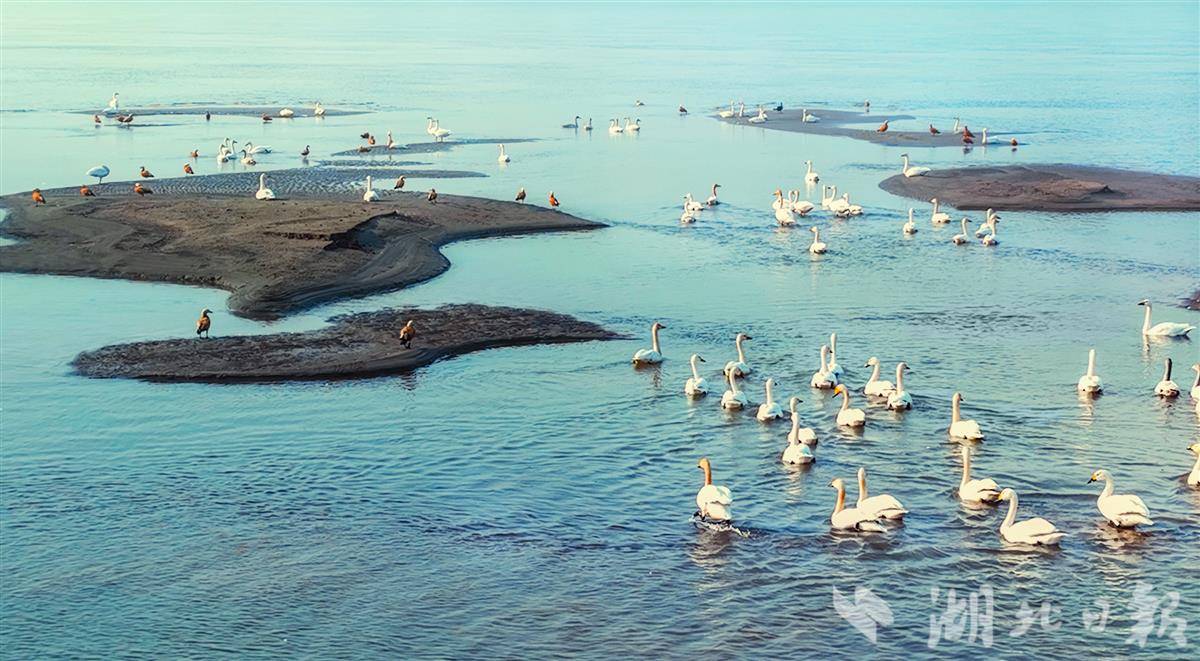 12月18日,鄂州市华容区芦花村旁的江心洲,成群结队的天鹅、赤麻鸭等越冬水鸟或嬉戏、或飞翔、或在江中的滩头休憩,成为当地一道亮丽且灵动的生态风景线。近年来,该区建立河(湖)长巡查机制,加强长江岸线的环境治理,随着生态环境持续改善,来此越冬的天鹅等候鸟数量逐年增多。(湖北日报通讯员方仲华 吕炎明 摄)