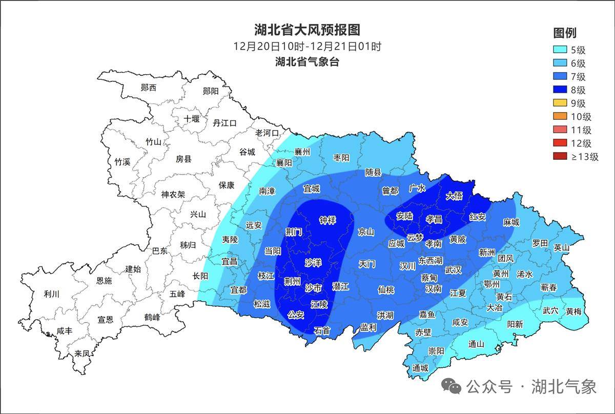 湖北日报讯(记者胡雯洁)20日晨,湖北省气象台发布大风蓝色省级预警:受冷空气影响,预计20日上午至前半夜,襄阳东部、宜昌东部、荆门、荆州、天门、仙桃、潜江、随州、孝感、武汉、鄂州、咸宁、黄石、黄冈等地将出现6到8级偏北阵风,建议加固临时搭建物、避免高空作业,防范对交通航运、设施农业等不利影响。