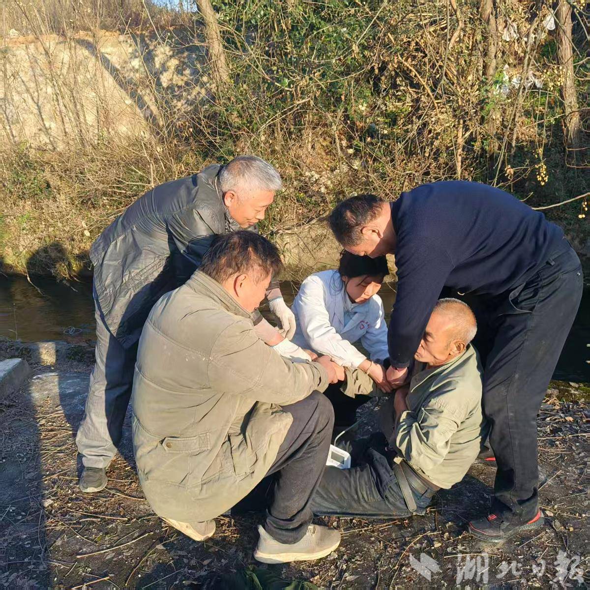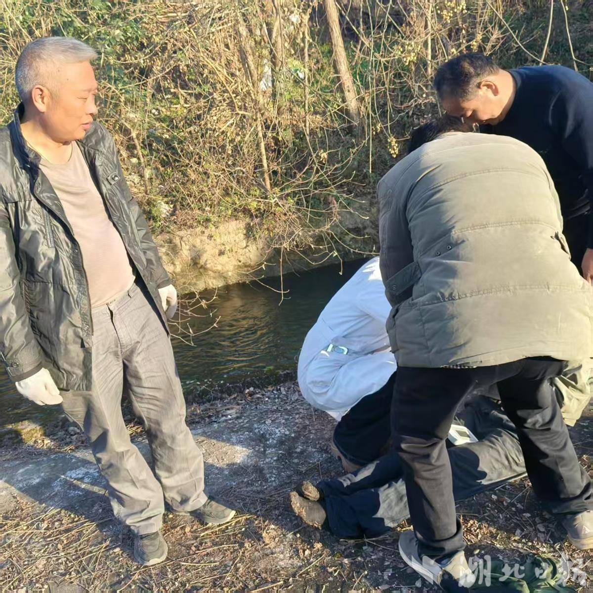 杨明赶忙找来一件外套给落水男子披上,随即联系江湾村党支部书记雷伟,协调村医务室医生前来抢救,并拨打120急救电话。5分钟后,村医务室医生赶到现场开始急救。15分钟后,救护车抵达杨明家,将落水男子送到十堰市郧阳区第二人民医院抢救。次日,该男子安全出院。