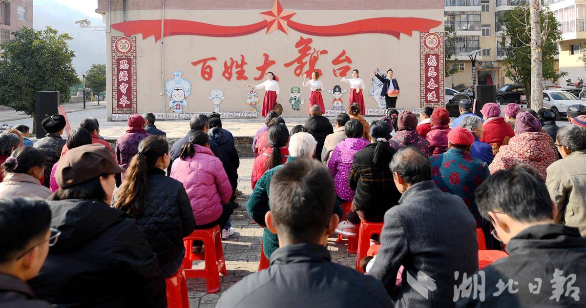 12月19日,保康县黄堡镇黄堡街社区,文艺工作者用三句半、歌舞等形式,向党员干部群众宣讲党的二十届四中全会精神。