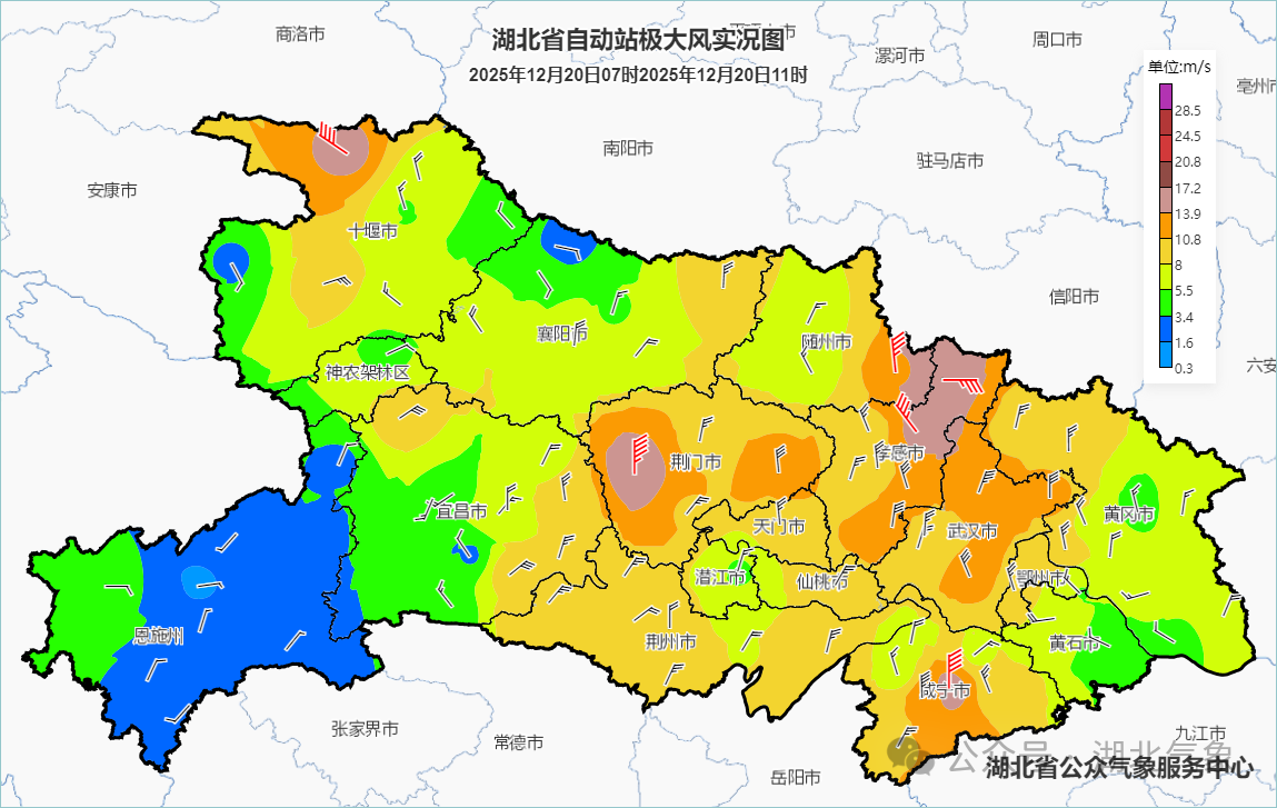 20日,湖北省气象台发布大风蓝色省级预警,上午十堰、宜昌、随州、孝感、荆门、武汉等地出现6-8级北风,随县田王寨站点和黄陂区黄陂矿山站点达9级。20日,鄂西阴天有小到中雨,半高山以上地区有雨夹雪或雪,高山地区有中到大雪、局地暴雪。其他地区阴天有小雨,其中鄂东北高山地区有雨夹雪。鄂西地区雨夹雪或雪最明显时段为20日11时到前半夜。