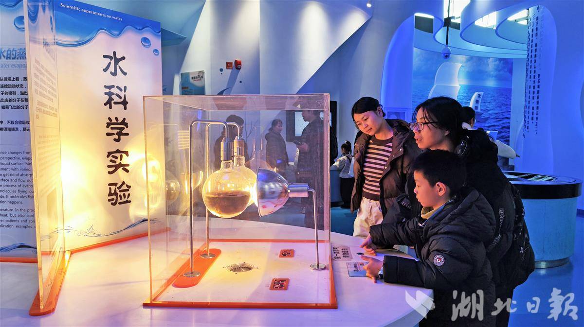 12月14日,武汉科学技术馆,家长带着孩子体验水科学实验的乐趣。