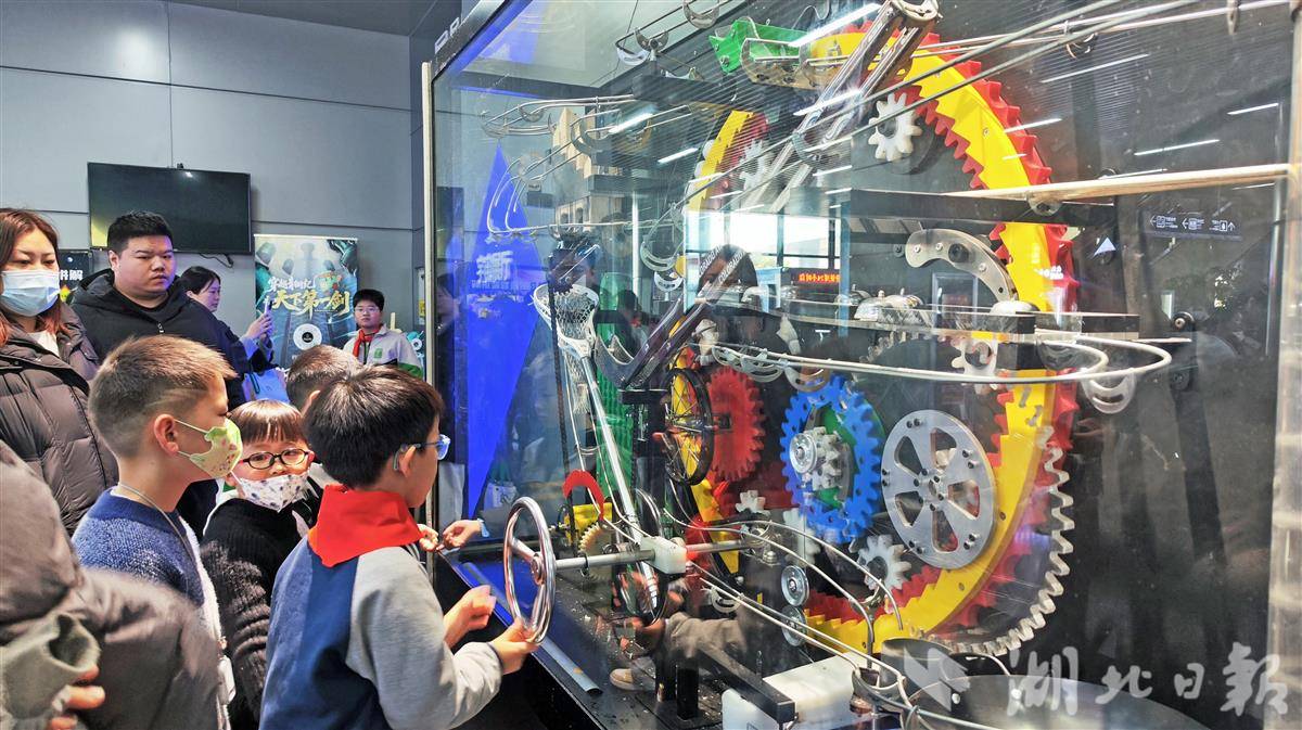 12月14日,武汉科学技术馆内,宇宙展厅的机械互动装置吸引许多孩子动手体验。