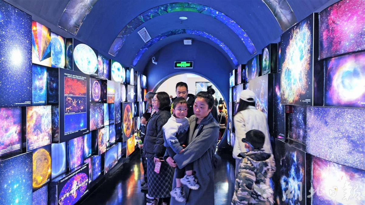 12月14日,武汉科学技术馆宇宙展厅的星空隧道吸引了众多家长和孩子前来观看。