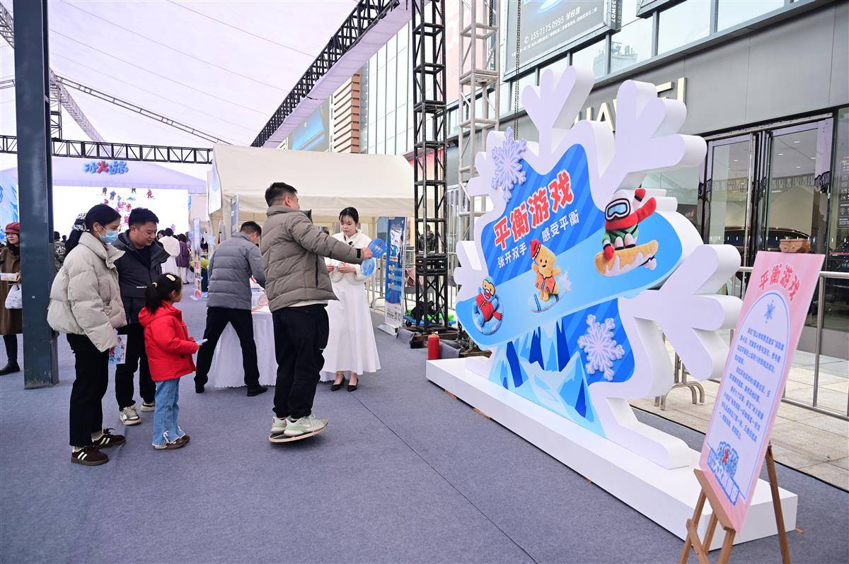 活动现场,市民展开双臂,在互动中感受冰雪运动的平衡技巧