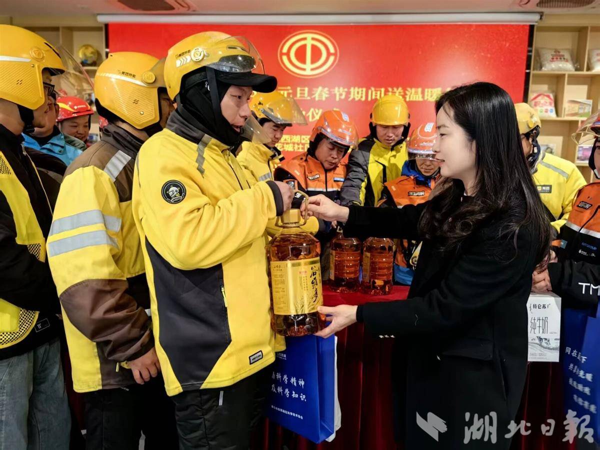 东西湖区总工会为外卖骑手、快递小哥等新就业形态劳动者送上米、油、牛奶等暖心礼包