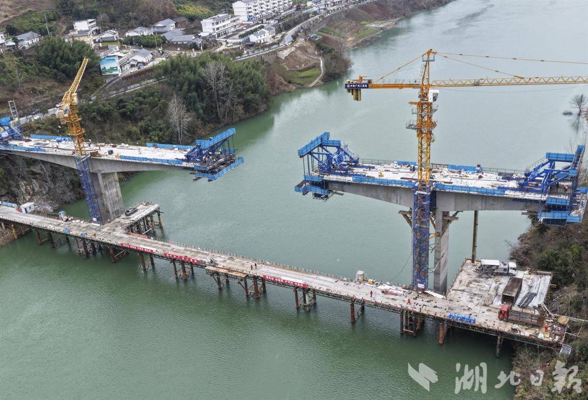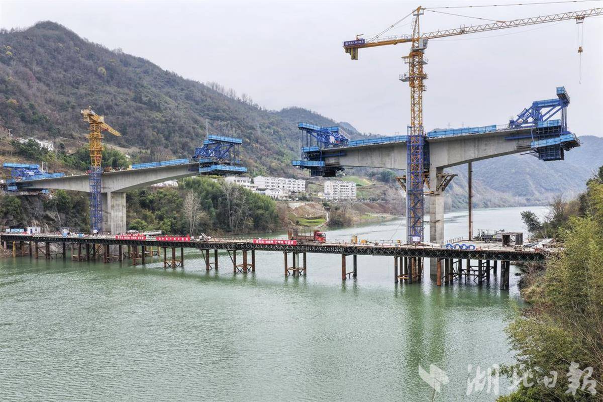 湖北日报讯(通讯员邵义龙)2025年12月21日,十堰市竹山县,接连楼台乡白莲村和文峰乡东钦村的钦峪堵河大桥建设工地,工人正在紧张施工。