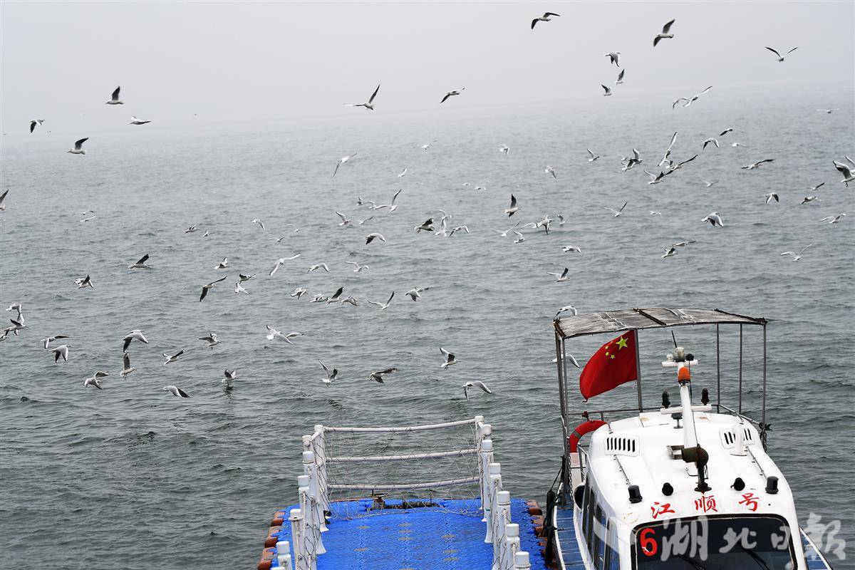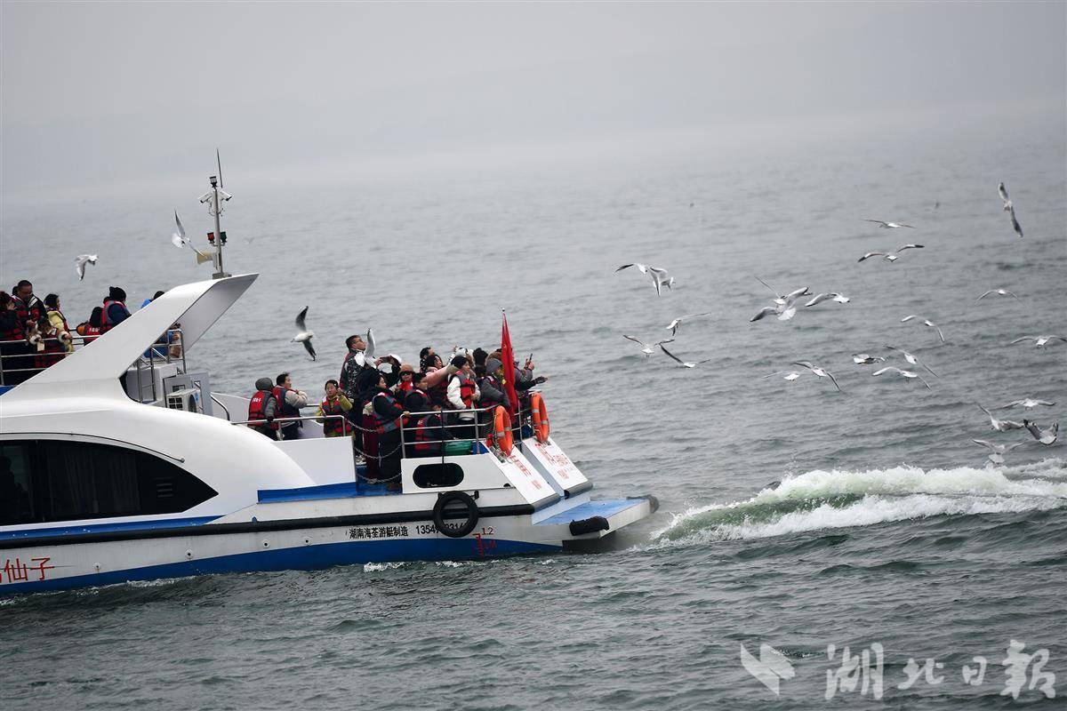 澄澈的水面上,成群的鸥鸟或振翅翱翔,或跟随在游船后面接食,或俯冲入水觅食,或悠闲漂浮水面嬉戏,与碧水蓝天相映成趣。入冬以来,各地游客慕名而来,驻足岸边拍照打卡、投喂鸥鸟,近距离感受人与自然和谐共生的美好画面。