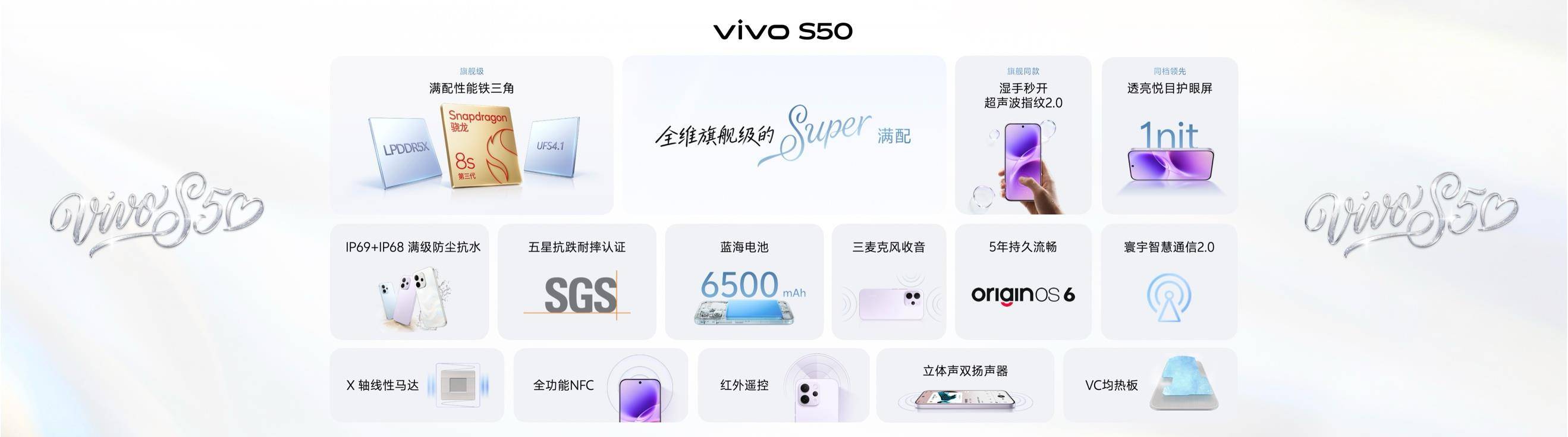 屏幕方面,vivo S50支持最低约1nit超低亮度与4320Hz高频PWM调光,在暗光环境中有效减轻视觉疲劳;vivo S50 Pro mini支持全屏AOD熄屏显示,无需点亮屏幕即可查看关键信息。X轴线性马达与立体声双扬声器带来细腻振感与饱满音效。全系支持IP69+IP68防尘抗水,为日常使用提供旗舰级防护。